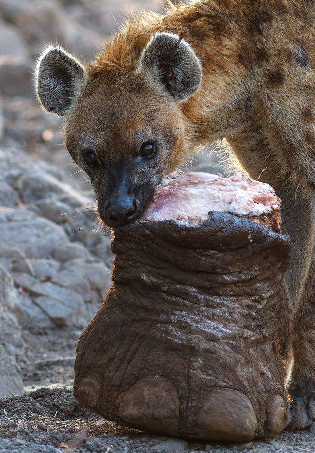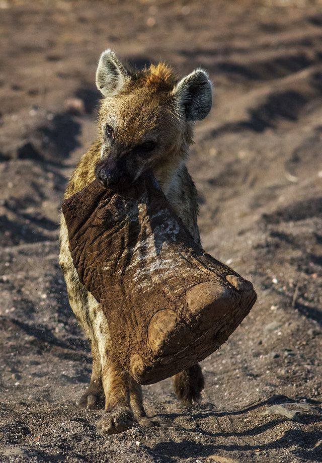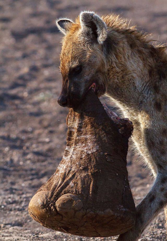 Майку удалось запечатлеть молодую гиену, которая умудрилась отгрызть от гниющего тела ногу. Гиены славятся своими крепкими челюстями, но такой масштаб фотограф увидел впервые.