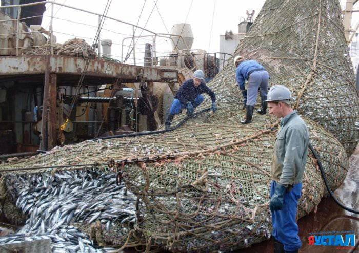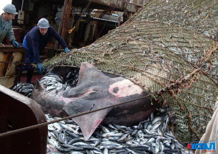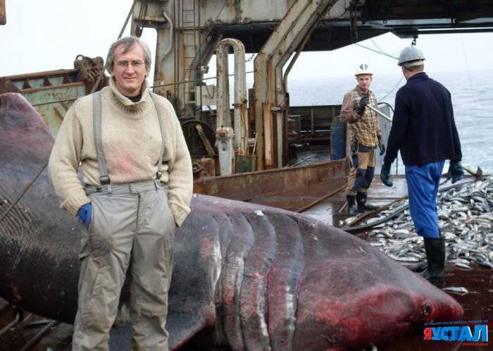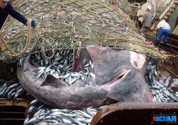 Мужики на обычном рыболовецком судне вытащили партию рыбы сетью, и среди мелочи нашли действительно большую рыбешку - огромную акулу. Размахом рук размер улова другим рыбакам не покажешь - придется таскать с собой фотку.