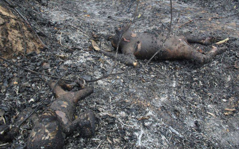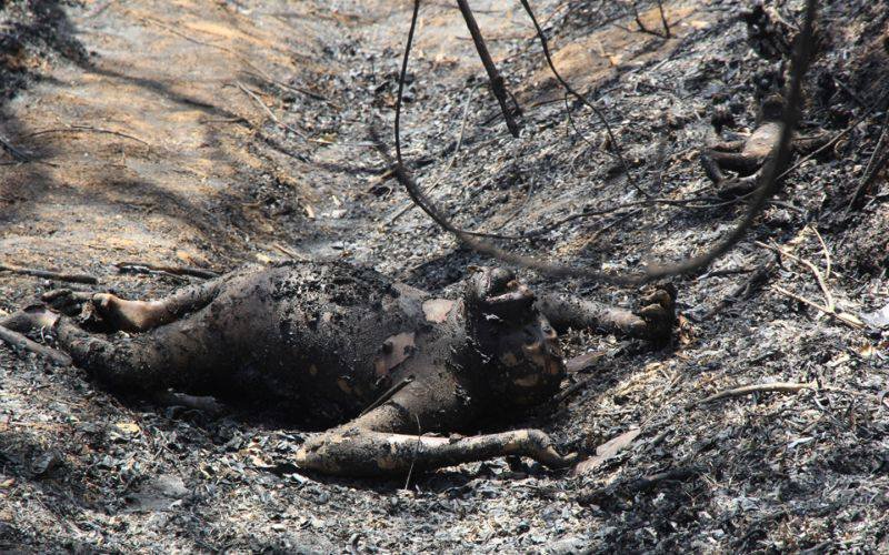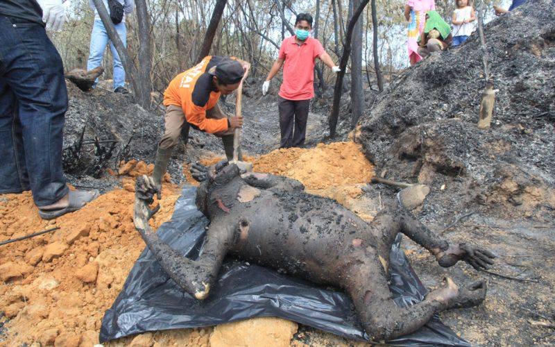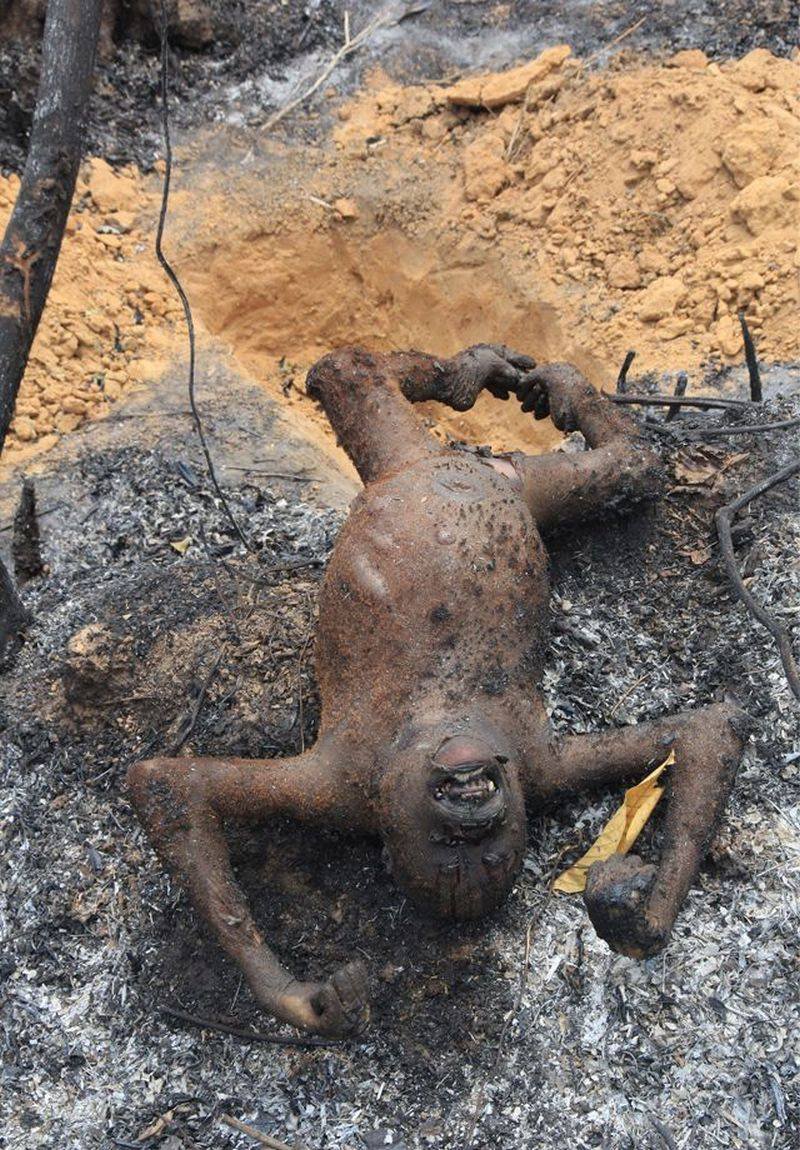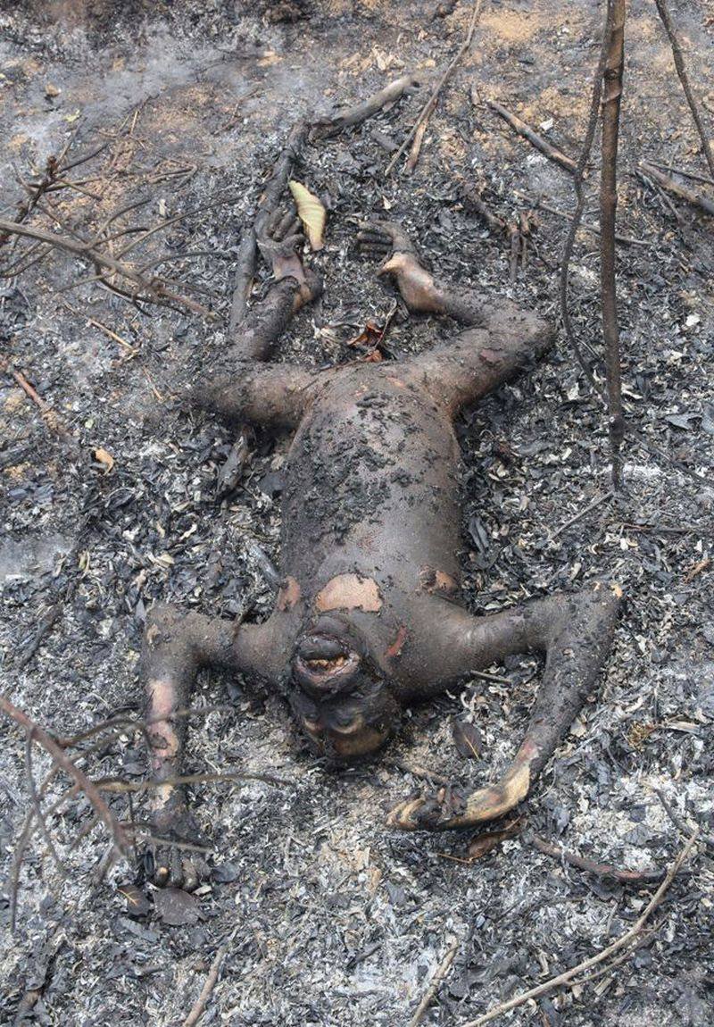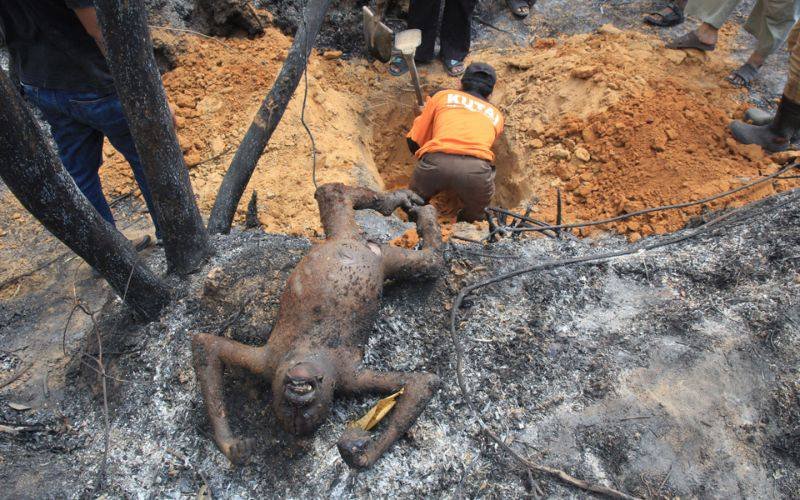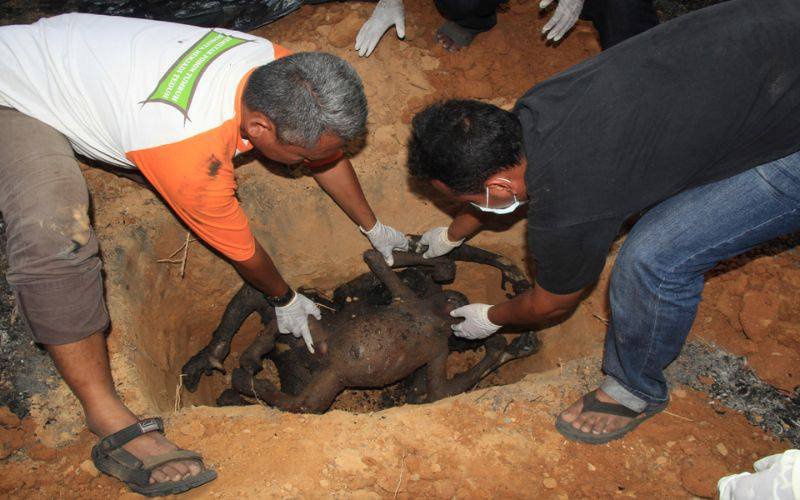В национальном парке Кутай, расположенном рядом с индонезийским городом Бонтанг, случился пожар. Обычно орангутаны, обитающие на деревьях, легко спасаются в подобных ситуациях. Но эта семья из трех особей почему-то не смогла убежать. После исследования места происшествия животных похоронили.