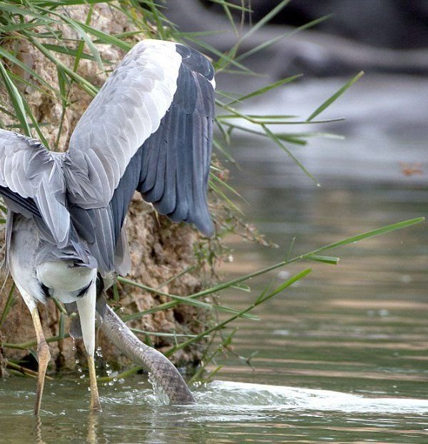 Эти удивительные кадры снял фотограф-любитель Sunny Inaganti на озере в штате Телангана на юге Индии. Цапля решила перекусить рыбкой, и когда она схватила улов, с удивлением обнаружила, что на ее ужин претендует еще и змея, которая также держала рыбу в зубах. Но клюв цапли оказался сильней зубов змеи, рыба досталась ей. Змея решила убраться восвояси, ведь цапли змей тоже едят...