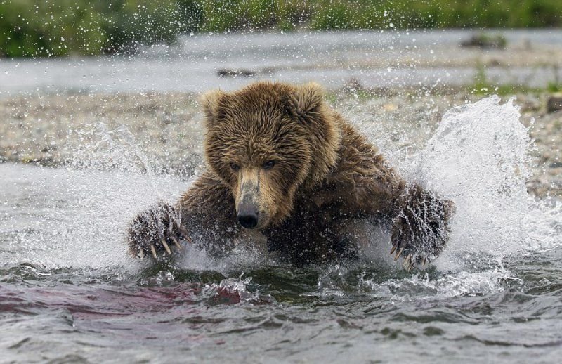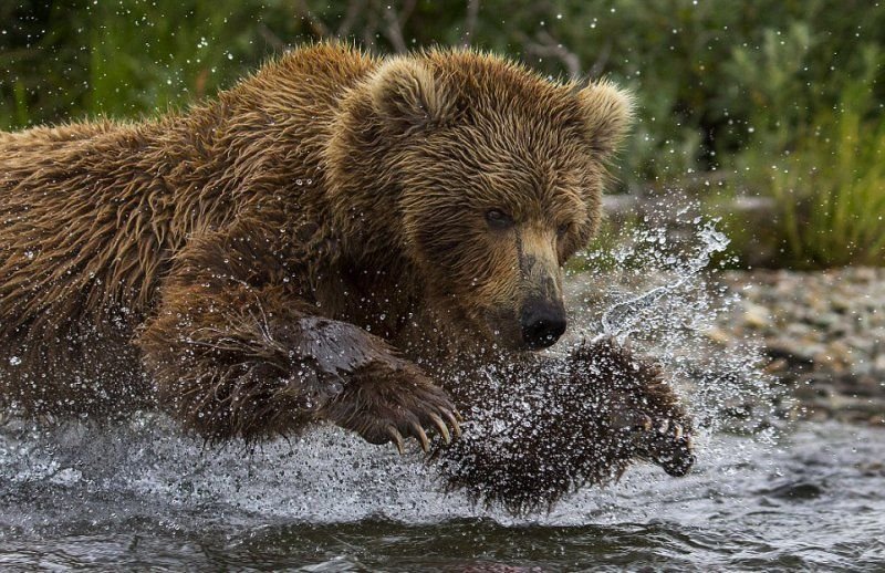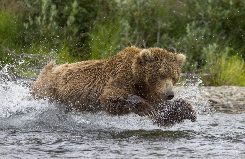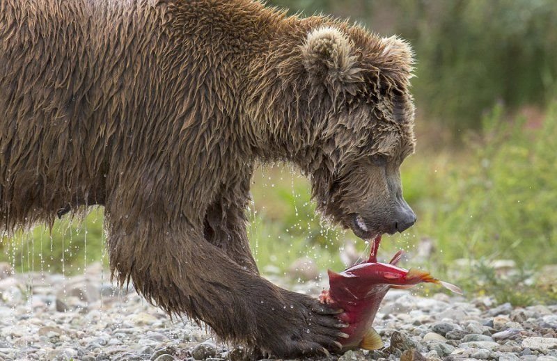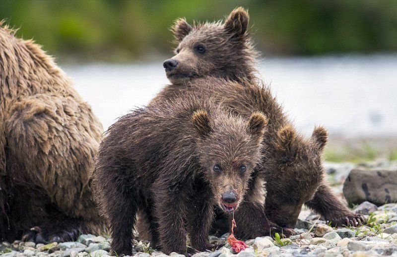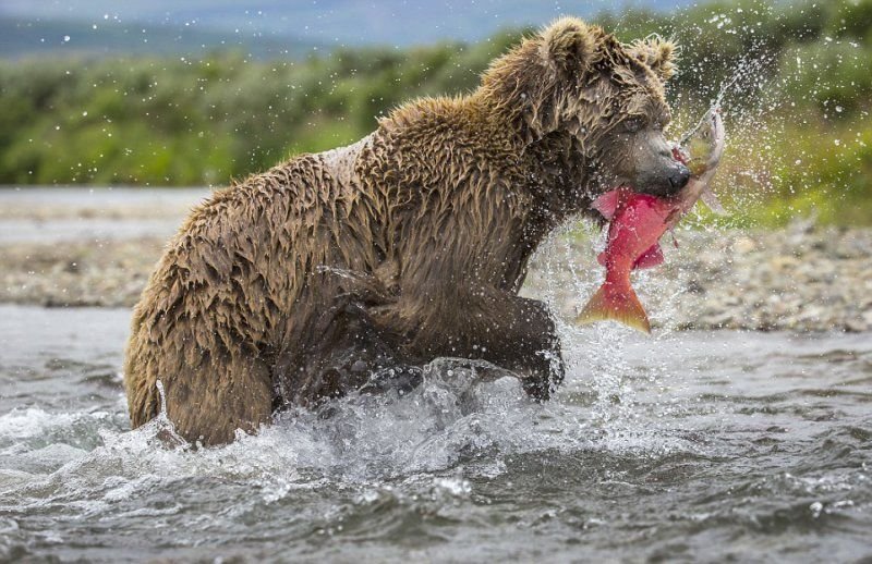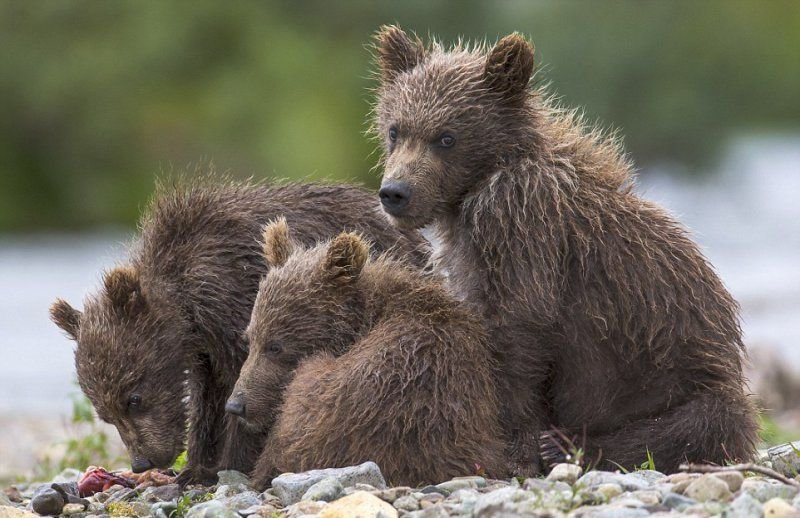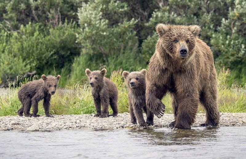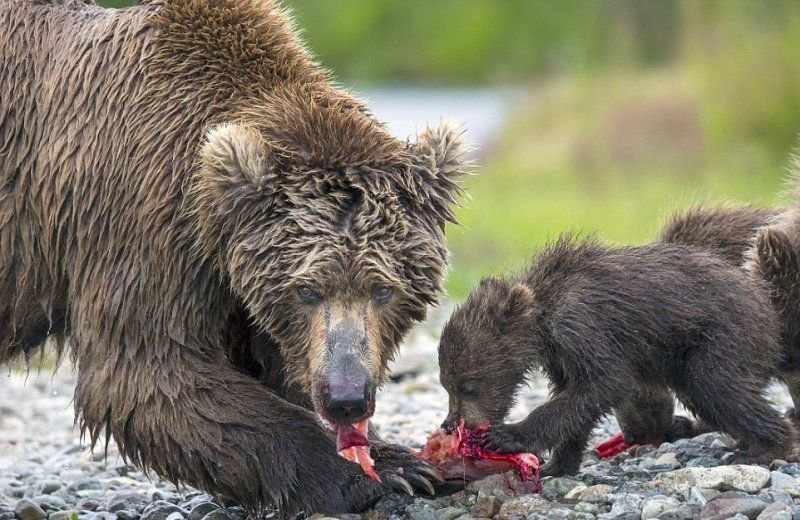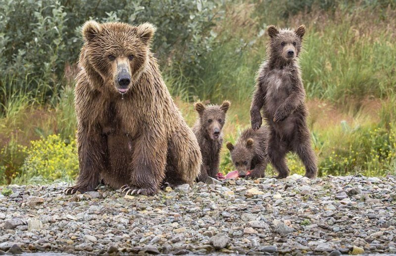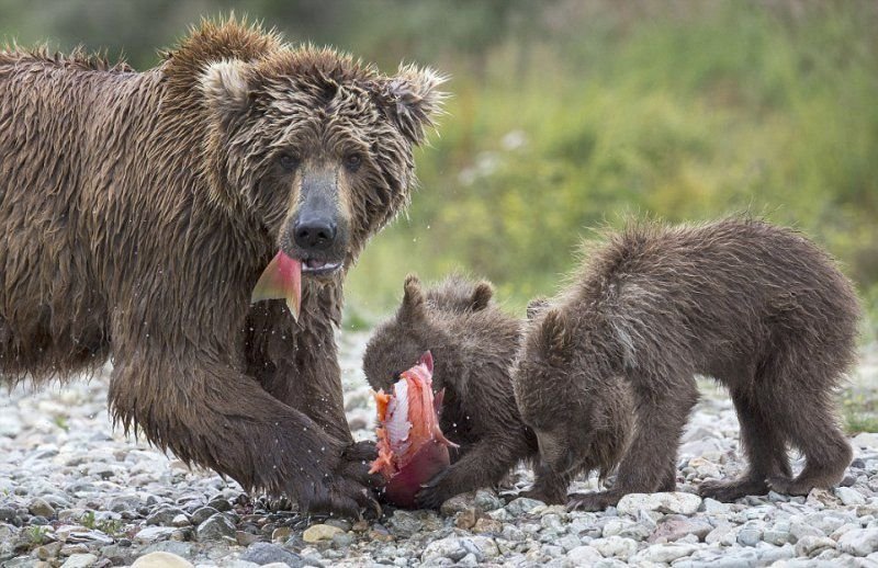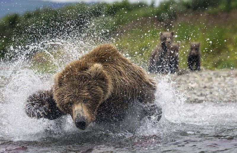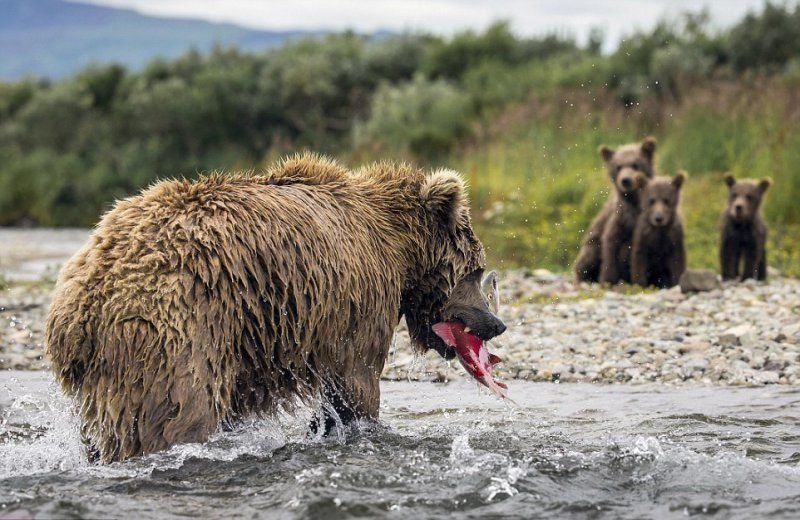 Эти интересные кадры сделал 43-летний фотограф из Люксембурга Кристоф Васселин (Christophe Vasselin) в национальном парке Катмай на Аляске. Мама-медведица ловко охотилась на лосося, что бы накормить своих троих медвежат, которые с нетерпением ждали ее на берегу. Фотограф очень рад, что ему довелось наблюдать такое зрелище и он смог все сфотографировать.