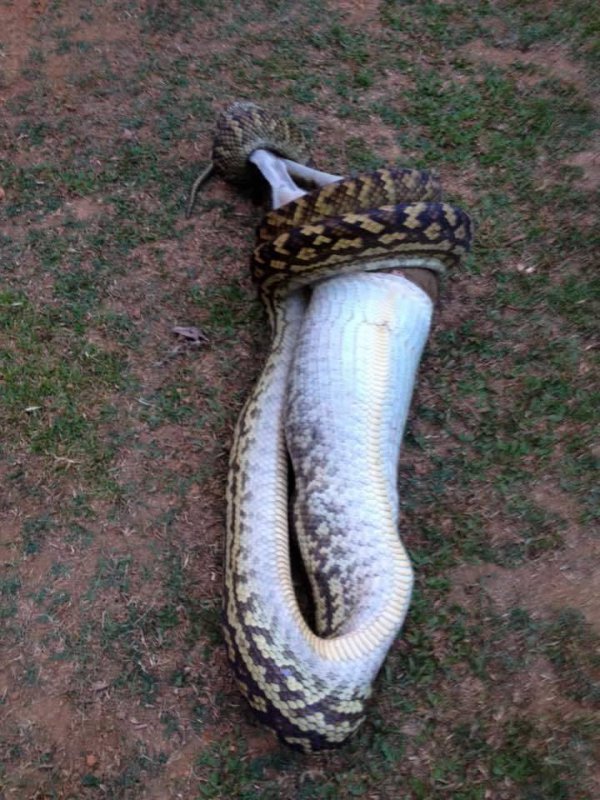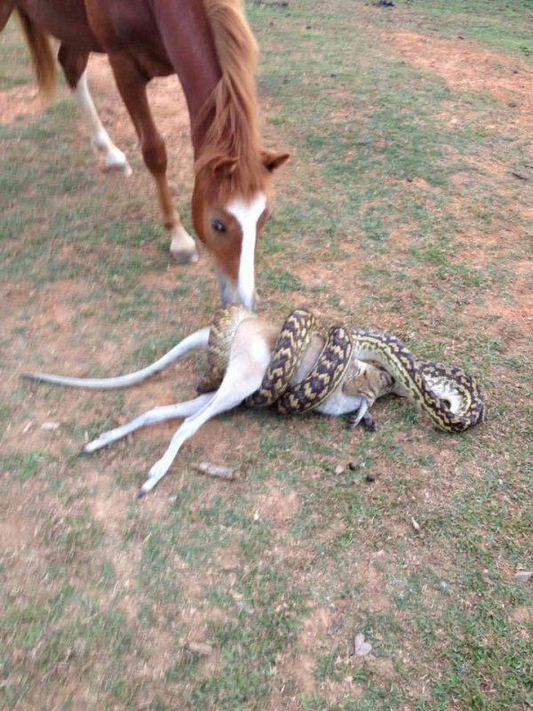 питон пытается проглотить кенгуру Запостил: Viking,4-01-2017, 06:16вЖивотные / Горячее Лошадь была шокирована, даже подошла ближе, чтобы рассмотреть жестокую сцену: большой питон зажал в свои смертельные тиски кенгуру и пытался целиком его проглотить. Эти драматические кадры снял Bernie Worsford в Северном Квинсленде (Австралия). питон пытается проглотить кенгуру Нравится 1 Не нравится 0 Комментарии (0) Добавить комментарий Прокомментировать Введите два слова с картинки: Отправить
