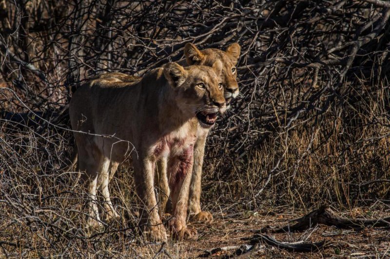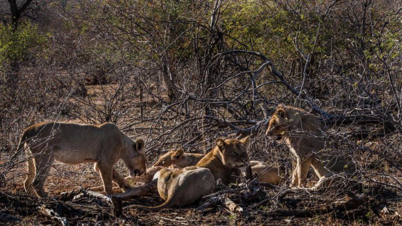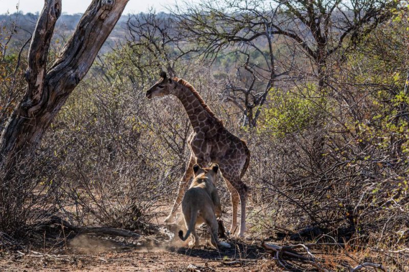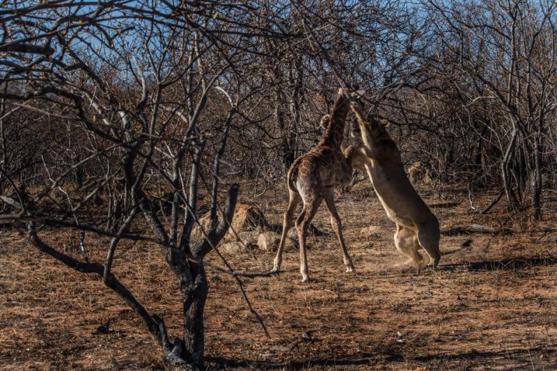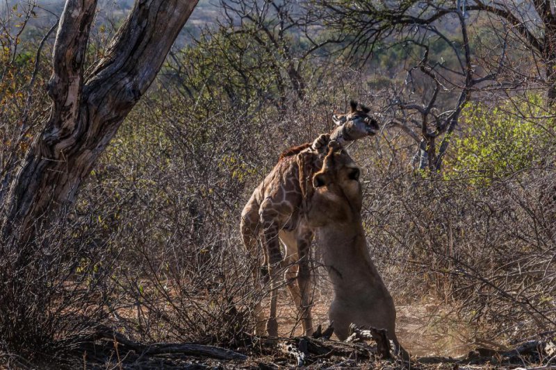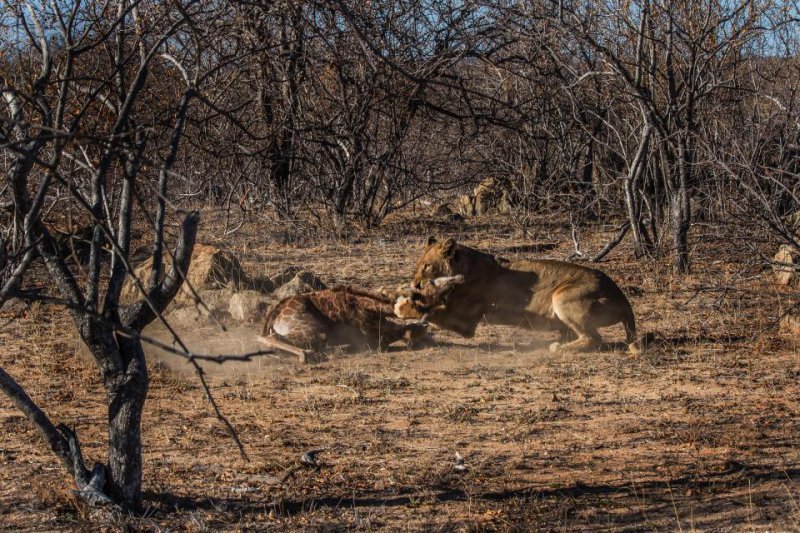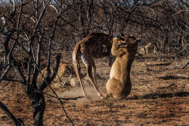 Маленький жираф спокойно стоял со своей мамой, на их беду неподалеку отдыхал прайд львов. Одна львица заметила легкую добычу и бросилась на маленького жирафа. Он два часа боролся за жизнь, но силы были неравны, львы пообедали мясом молодого жирафа. Эти драматические кадры снял 43-летний фотограф Karl-Heinz Fechter в заповеднике Балуле возле города Худспрут, Южная Африка.