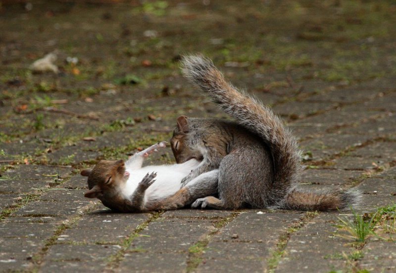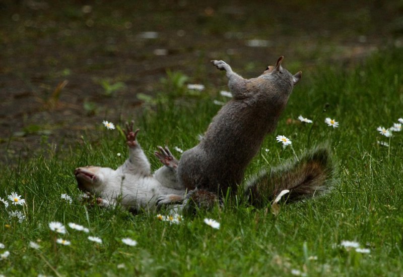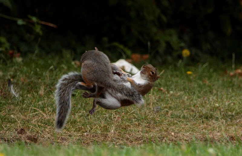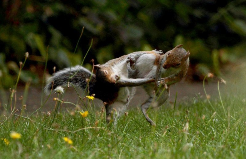 47-летний фотограф-любитель Мартин Докер (Martin Docker) сделал эти удивительные кадры в саду Собачьего острова Лондона. Фотограф говорит: "У меня много снимков птиц, лис и других животных, которые бегали в саду, но на этот раз природа удивила". Две белки, словно в сцене из фильма о боевых искусствах, подпрыгивали и наносили удары друг другу. Неизвестна причина драки и сколько бы продолжался этот бой, но один из зверьков применил грязный прием — он укусил соперника. Тот взвизгнул и убежал.