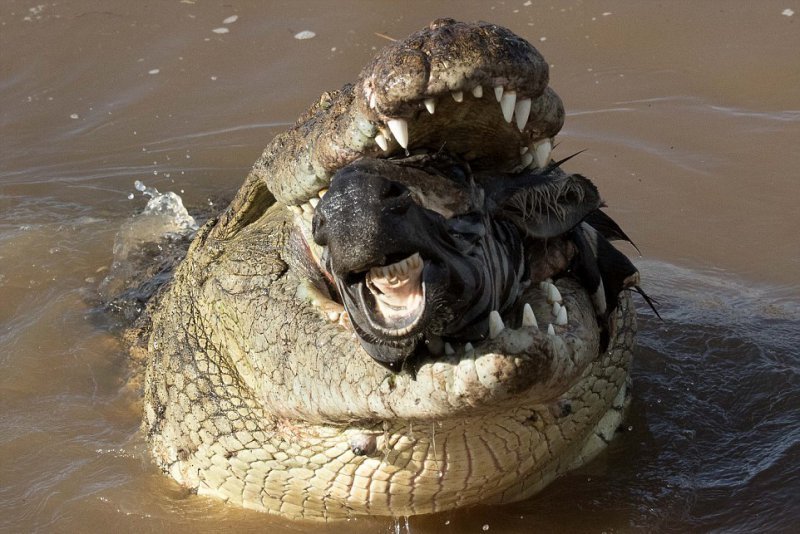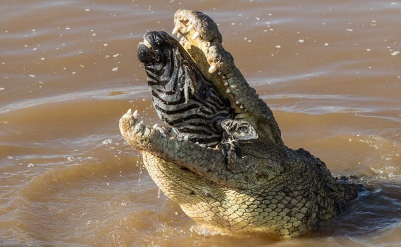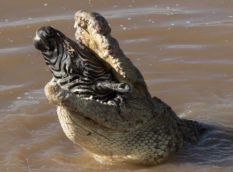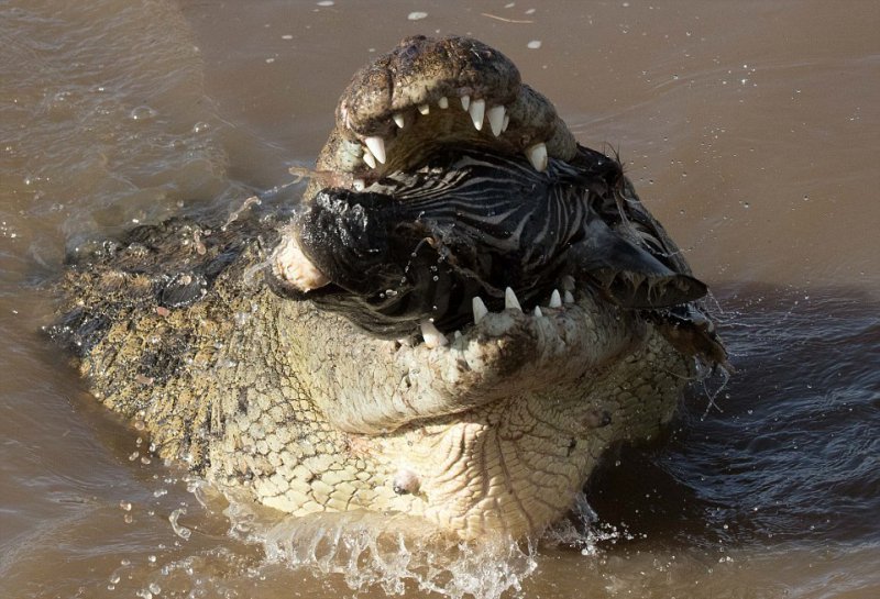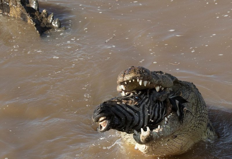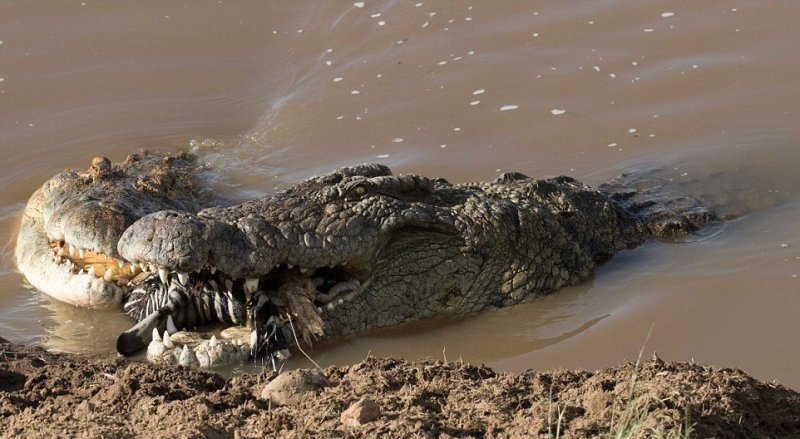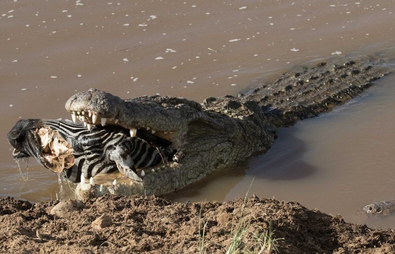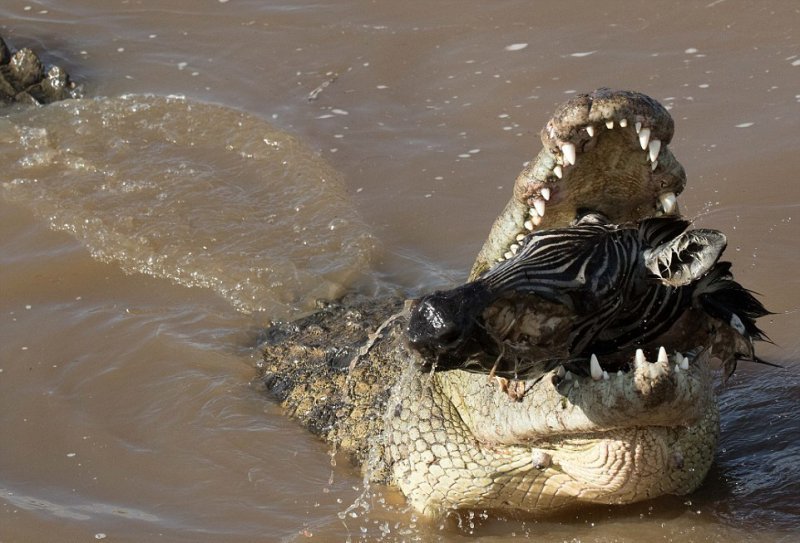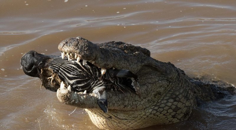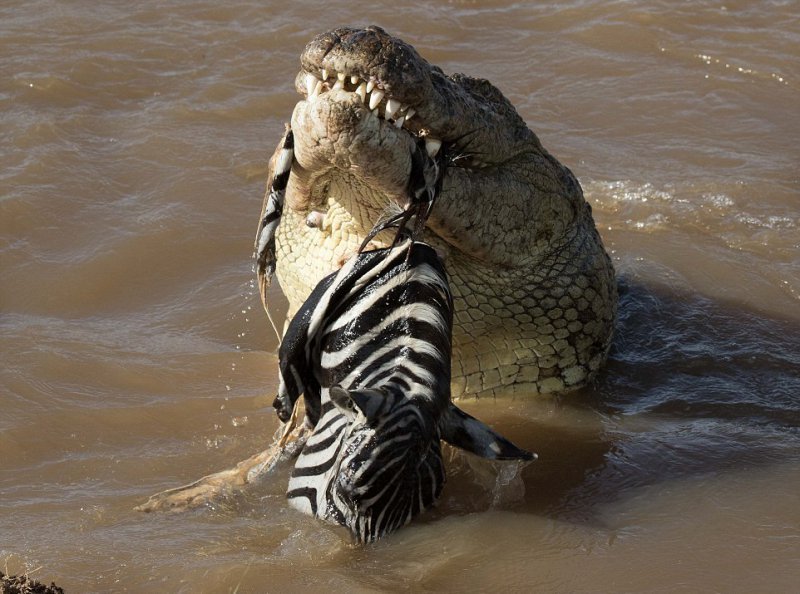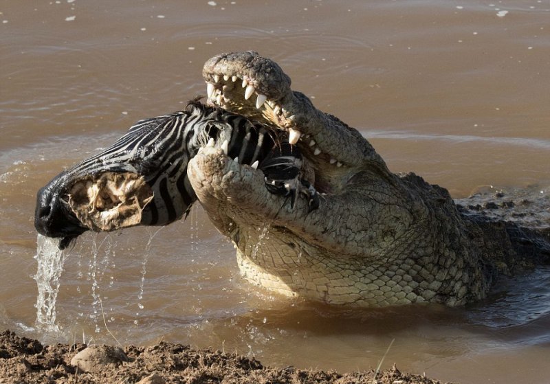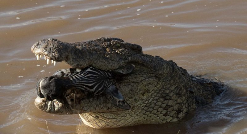 Множество животных погибают от зубов крокодилов во время переправы через мутные воды африканских рек. На этот раз не повезло зебре, огромный крокодил убил ее и практически сожрал. Только с головой возникли проблемы: мало того, что нелегко раскусить прочный череп зебры, так еще и товарищи всячески пытаются отхватить кусочек себе. Эти драматические кадры сделал фотограф Субраманьян Шридхаран (Subramanian Sridharan) в Национальном заповеднике Масаи Мара в Кении.