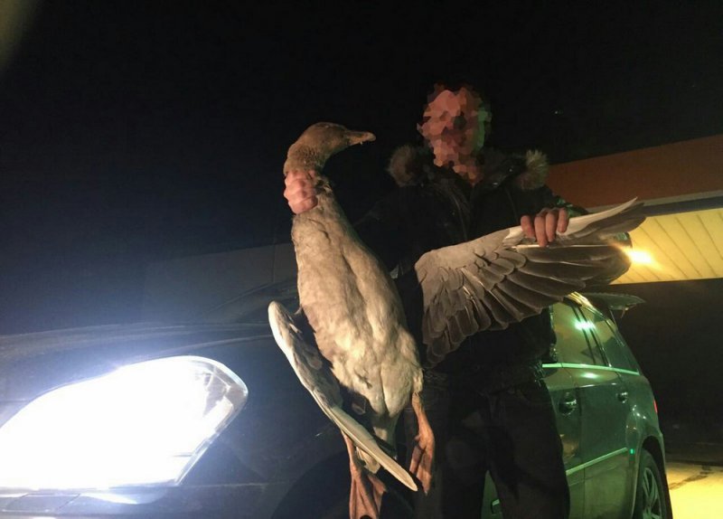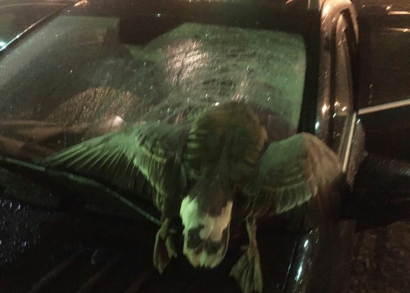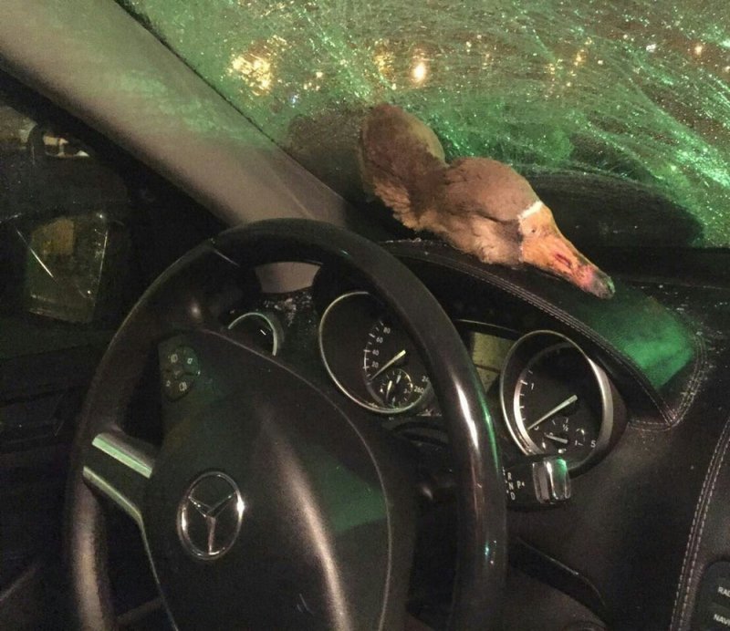 Неприятный случай произошел с водителем автомобиля Мерседес: он спокойно ехал по дороге, как вдруг удар в лобовое стекло, оно потрескалось и в салоне показалась голова гуся. Ситуация неприятная, придется менять лобовое стекло, но гусю не повезло еще больше: он погиб.