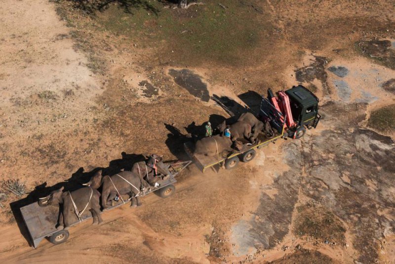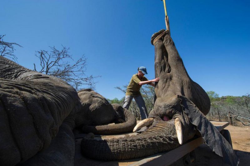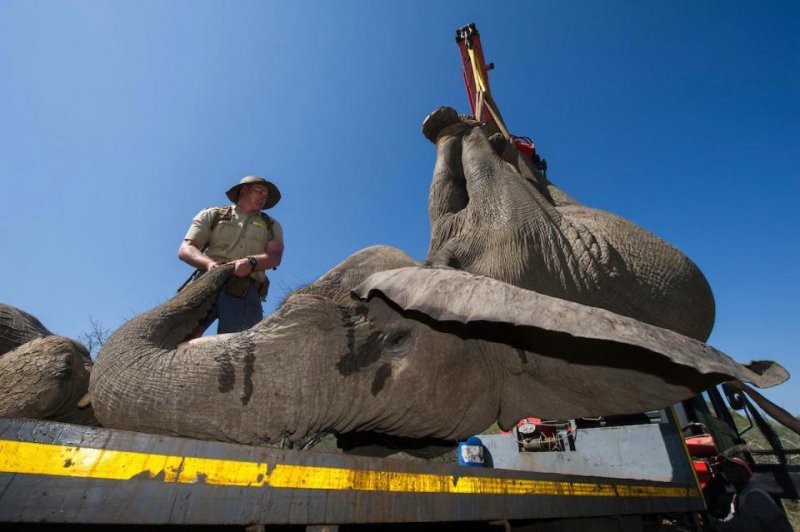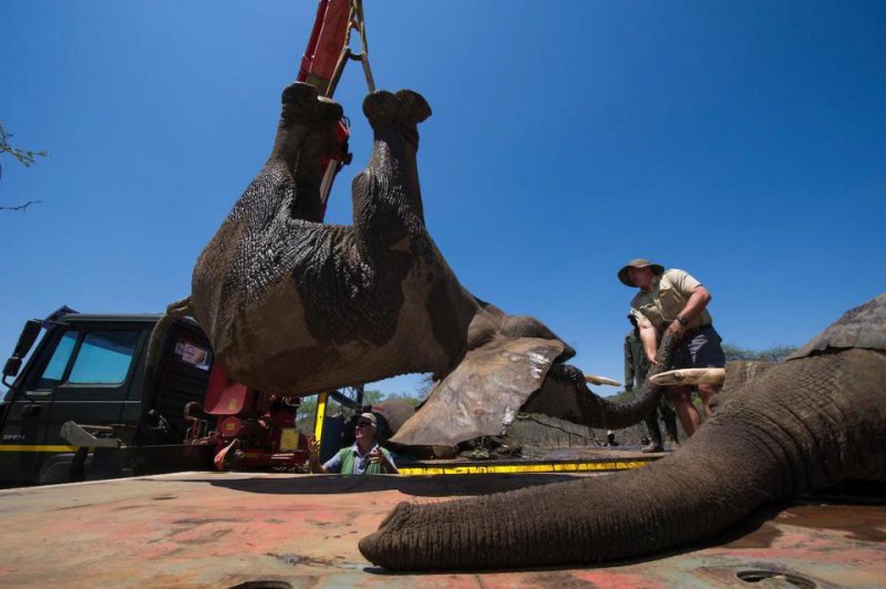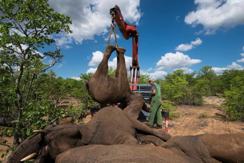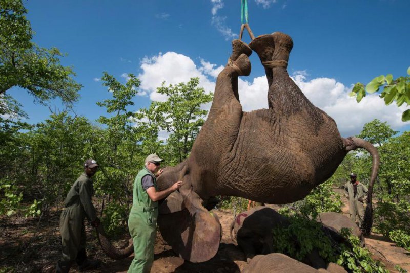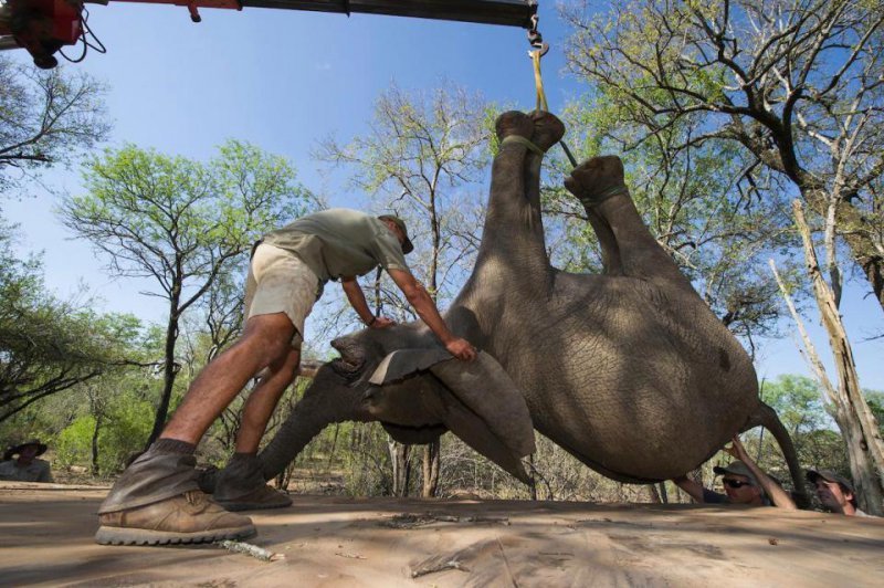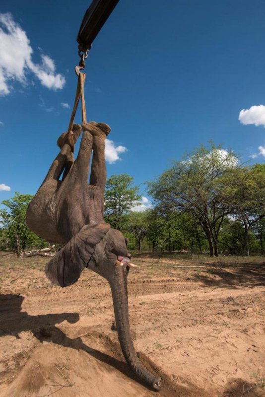 Запечатлеть этот интересный процесс был приглашен 58-летний фотограф Пит Оксфорд (Pete Oxford). Он говорит: «Такое не каждый день увидишь, слоны висят вверх ногами на подъемном кране».