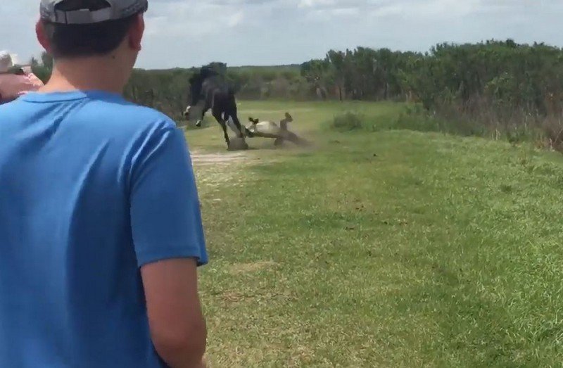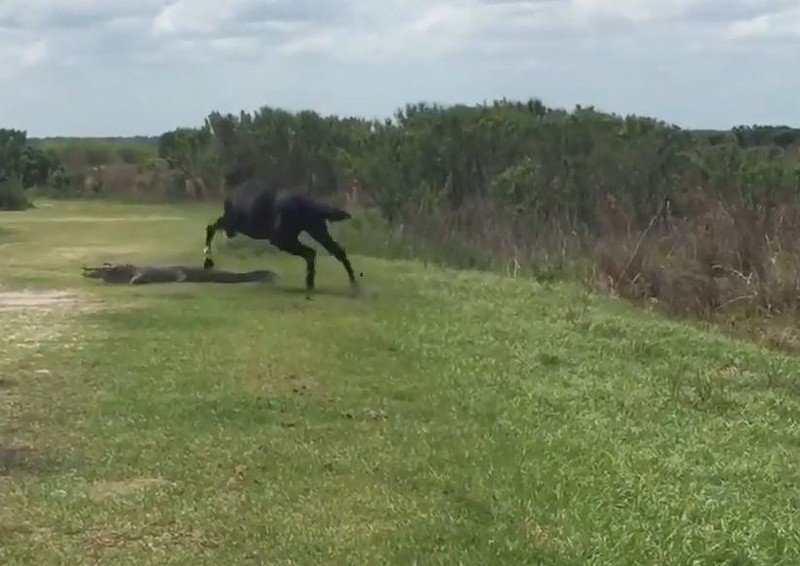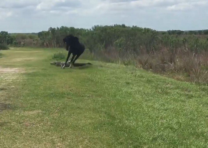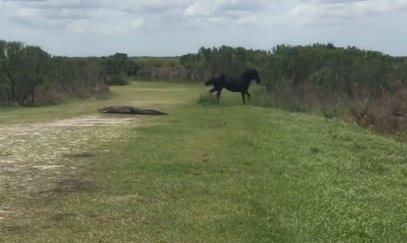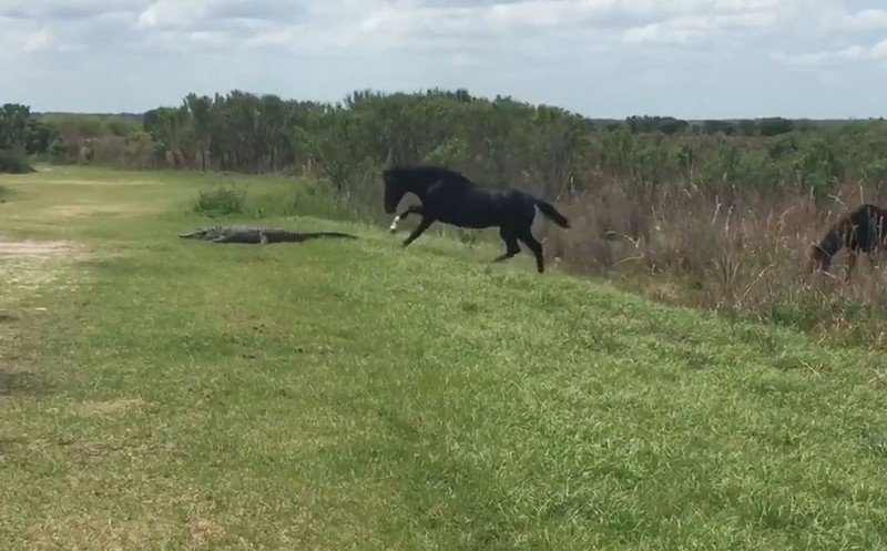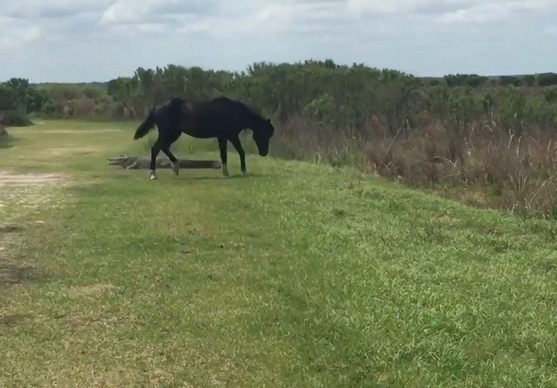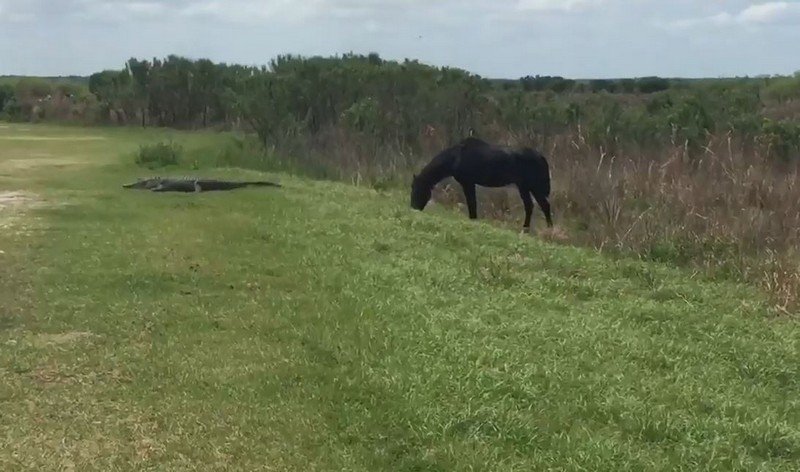 Туристы наблюдали необычную картину рядом с Гейнсвилл, штат Флорида. Крокодил спокойно лежал на травке и никого не трогал, рядом был небольшой табун лошадей. Вдруг одна лошадь резко побежала и нанесла несколько ударов копытами аллигатору. Тот не ожидал такой дерзости, но решил убраться, от греха подальше. А лошадка вернулась к своим товарищам и продолжила спокойно щипать травку.