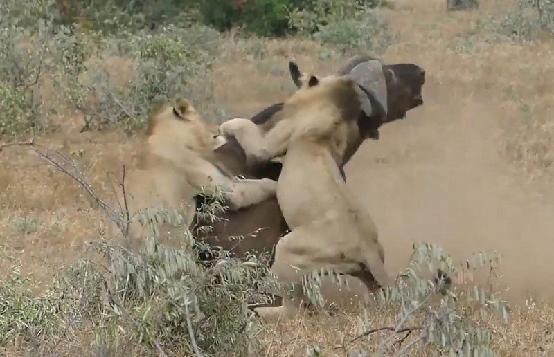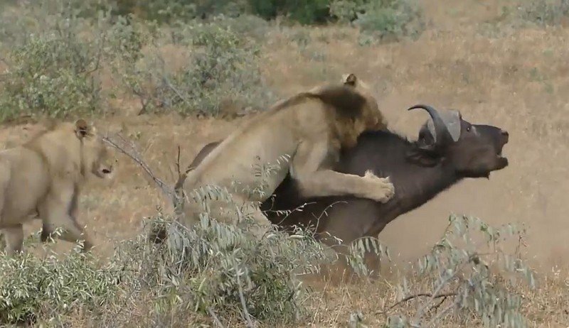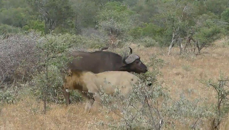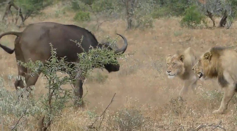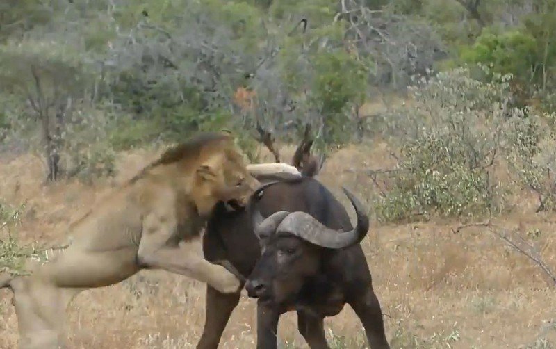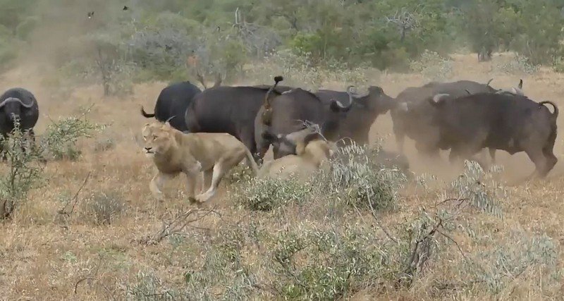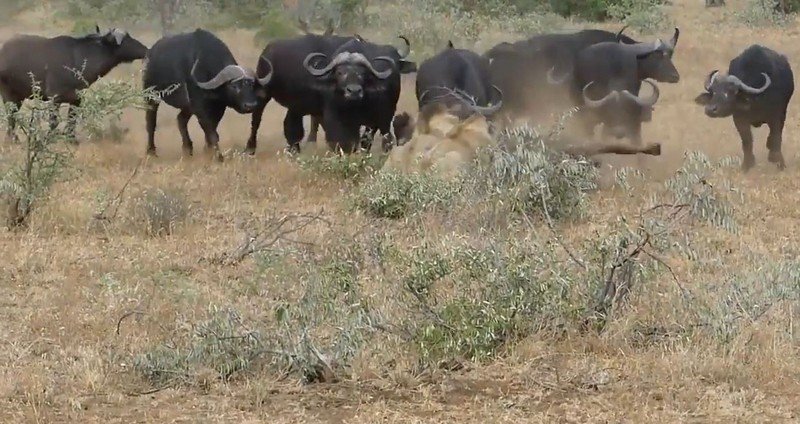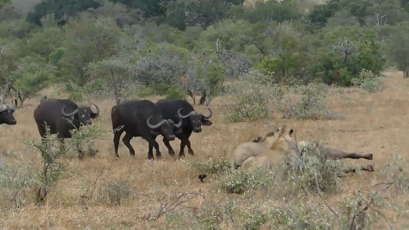 Удивительное видео сняли туристы в национальном парке Крюгера в Южной Африке. Два льва напали на молодого буйвола, завалили его и уже предвкушали сытный обед. Но стадо не бросило своего товарища в беде, они отогнали хищников и спасли буйвола. Он потрепанный, но живой присоединился к стаду.