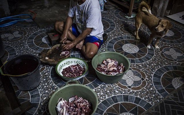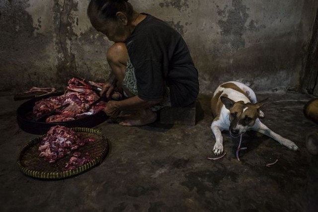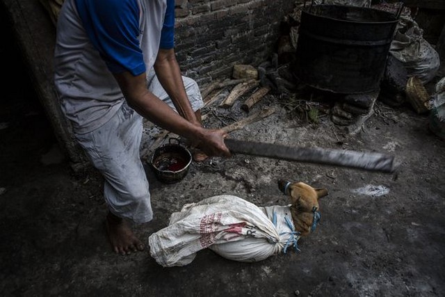 В цивилизованных странах собака — друг человека, а в Индонезии это лишь источник мяс. На этих жутких кадрах показана грязная скотобойня в городе Джокьякарта, где связанных псов убивают, разделывают и готовят из них еду.