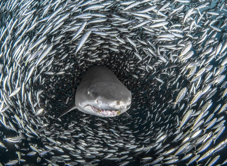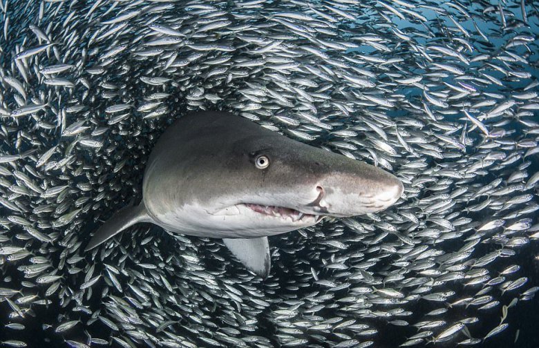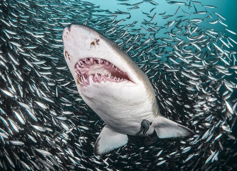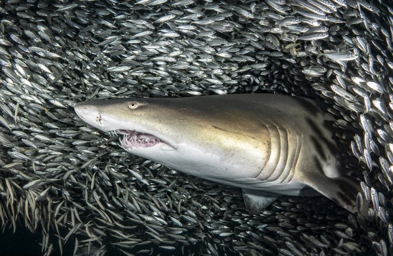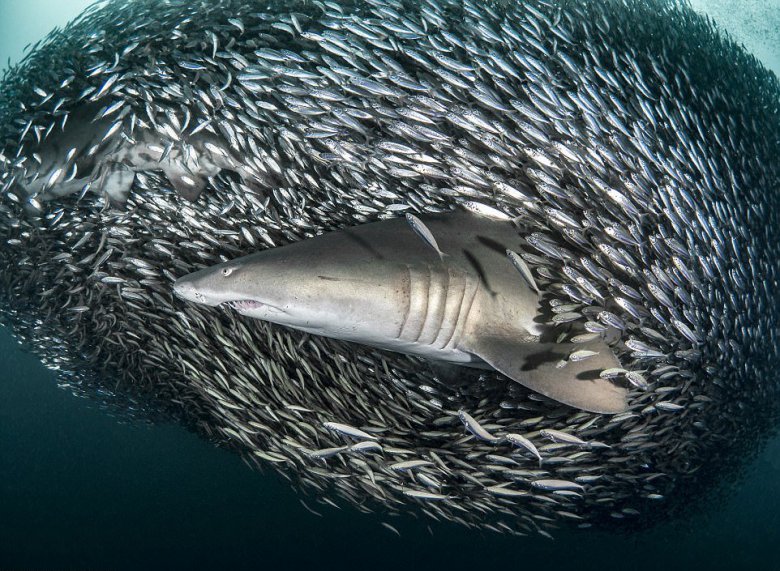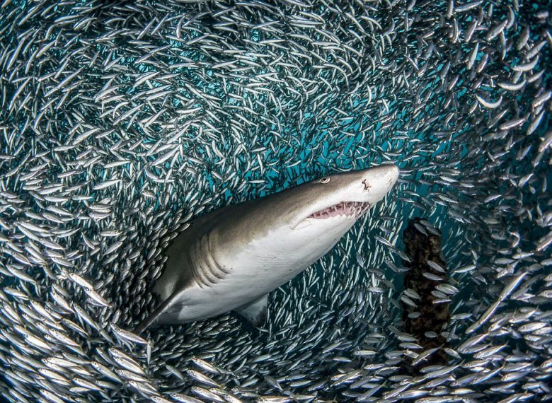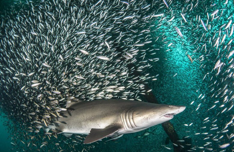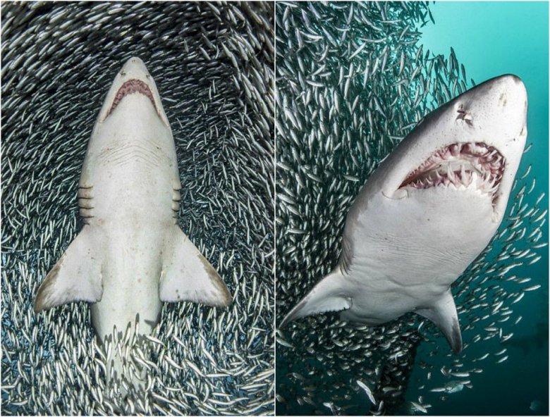 Эти удивительные кадры сделала 44-летняя фотограф Таня Хоуперманс (Tanya Houppermans) 10 июля в водах Морхед-Сити, Северная Каролина, США. Тигровые песчаные акулы проплыли через косяк рыб, образуя своеобразный туннель. Таня уже восемь лет фотографирует в этих местах, но такое зрелище увидела впервые.