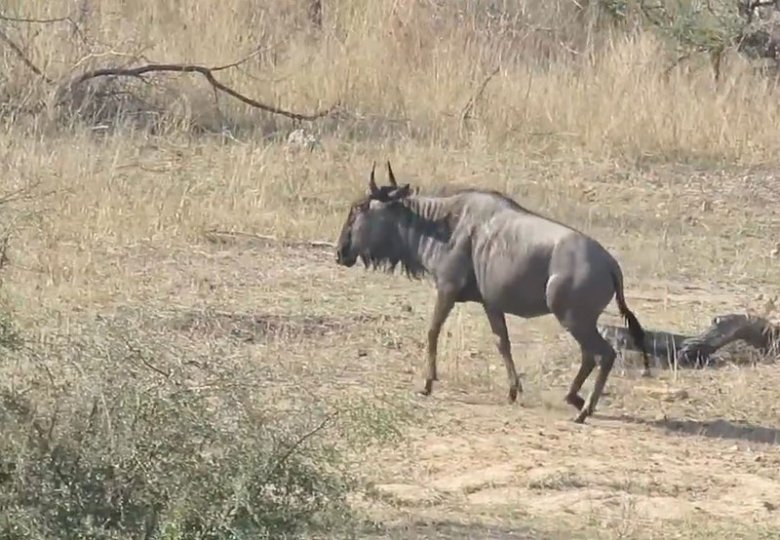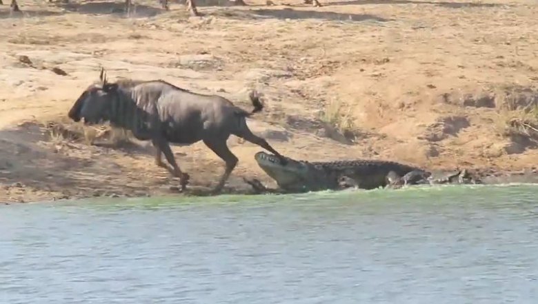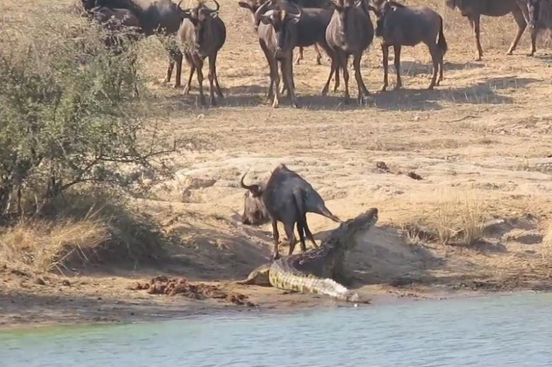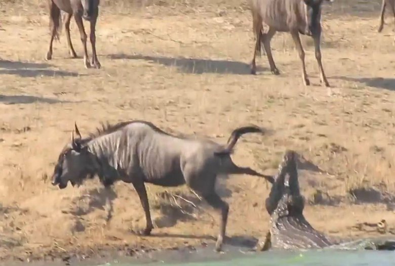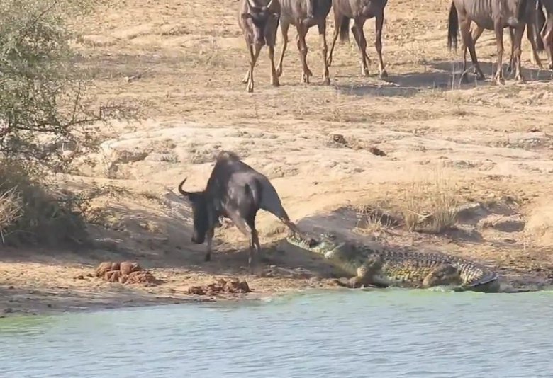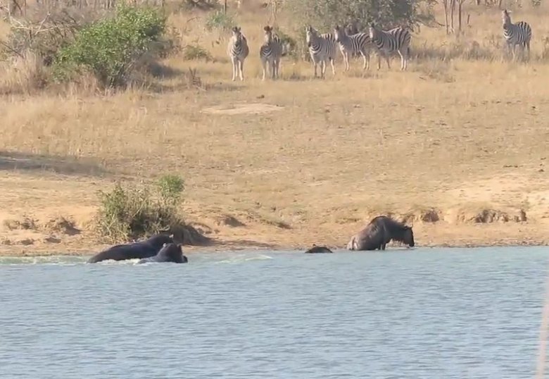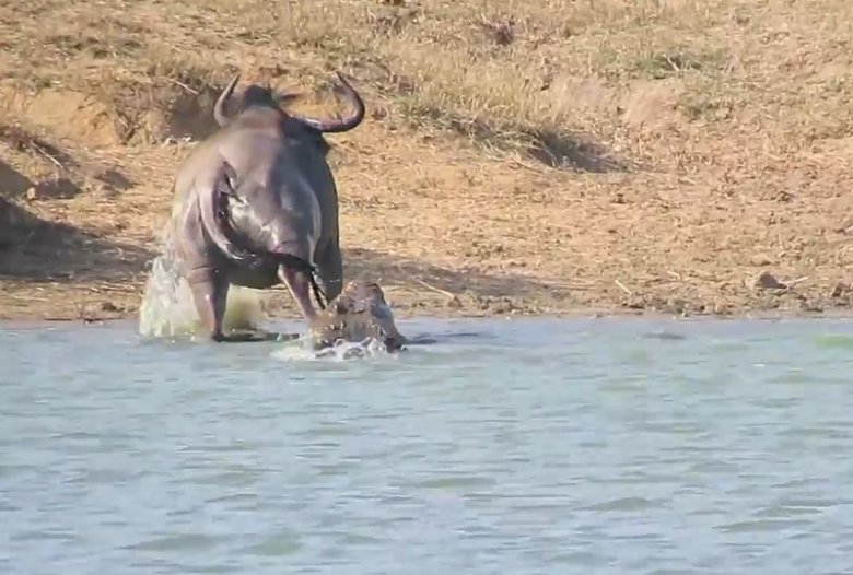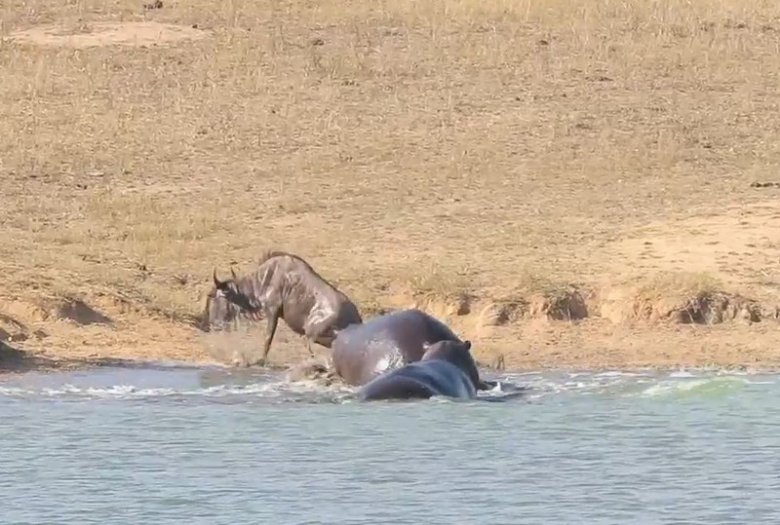 Удивительное видео снял 72-летний пенсионер Мервин Ван Вик (Mervyn Van Wyk) в Национальном парке Крюгера в ЮАР. Крокодил схватил антилопу гну за ногу, и практически уже утащил ее под воду. Эту картину наблюдали два бегемота, они бросились на крокодила и тем самым освободили антилопу.