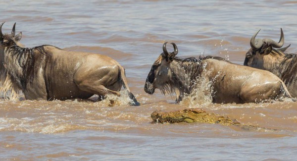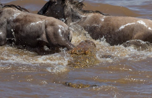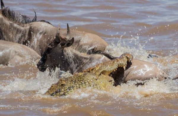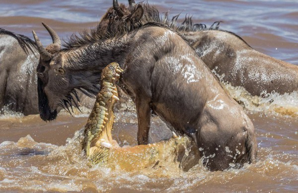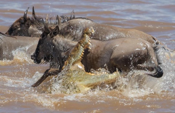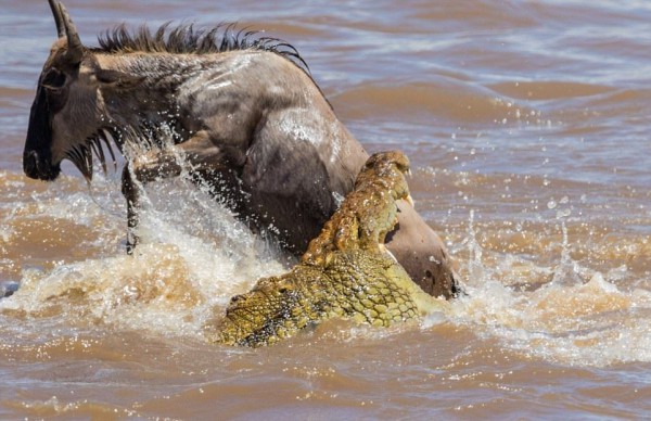 Захватывающие снимки показывают момент, когда одна из незадачливых гну попала в засаду голодного крокодила, при попытке пересечь реку.