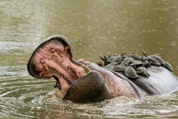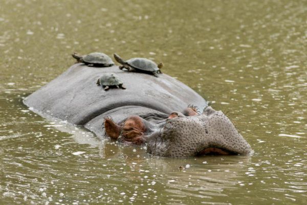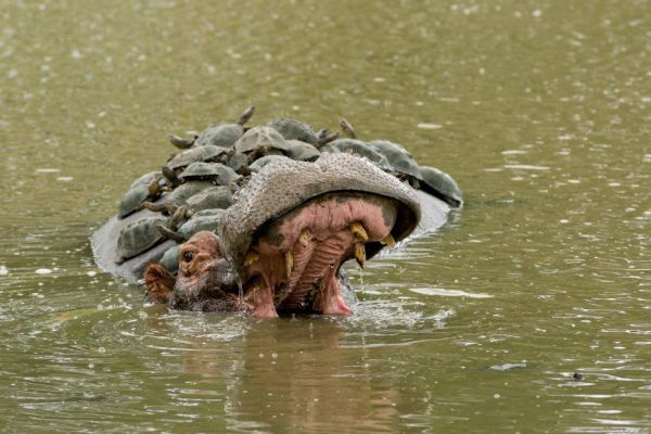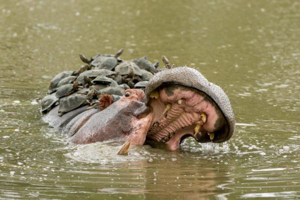 Свидетелем интересных событий стал 63-летний фотограф Adri Botma в национальном парке Крюгера в Южной Африке. Наглые черепахи устроились на спине бегемота, чтобы погреться на солнце. Непрошенные гости изрядно надоели бегемоту и он попытался их стряхнуть. Большинство черепах упало и это вызвало довольную ухмылку на морде гиппопотама.
