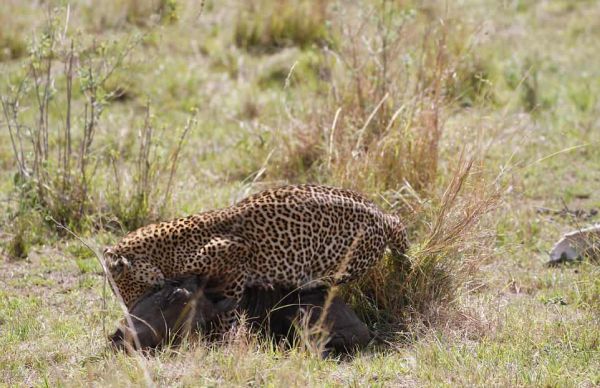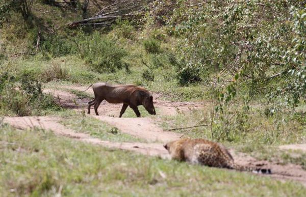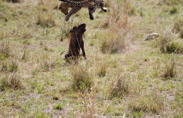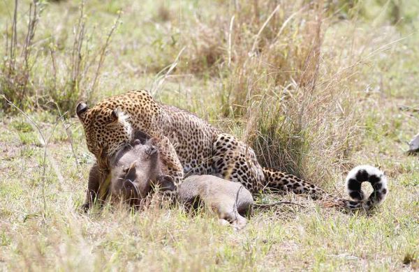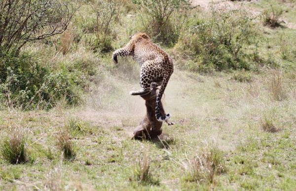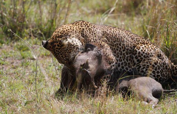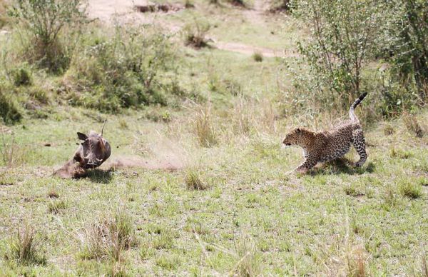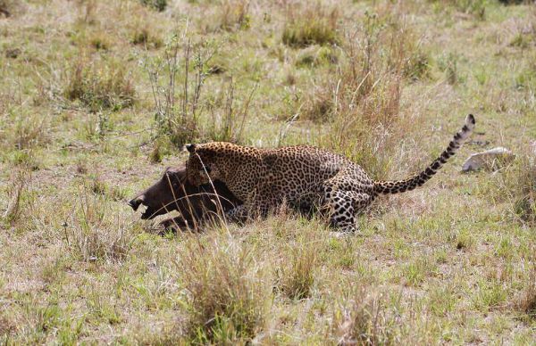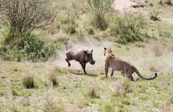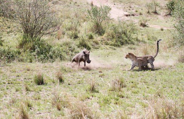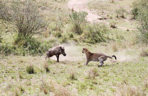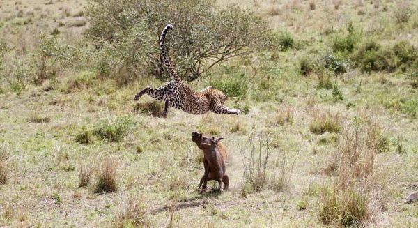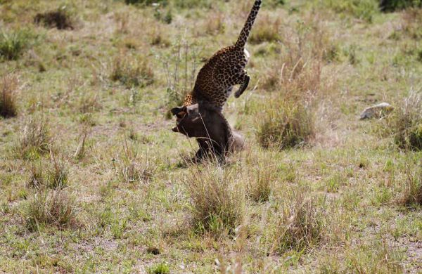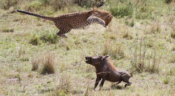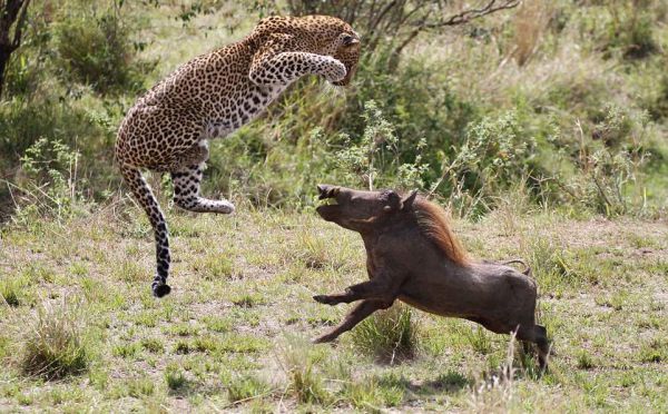 Захватывающие кадры охоты беременной самки леопарда на бородавочника снял 29-летний австралиец Питер Томпсон в заповеднике Масаи-Мара в Кении. Самка притаилась в кустах и покараулила бородавочника. Затем выпрыгнула перед растерянным кабаном. Хоть бородавочник и имеет острые клыки и довольно быстро бегает, спастись от леопарда у него шансов практически не было.