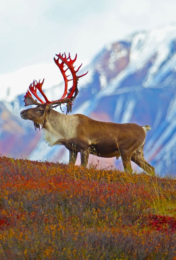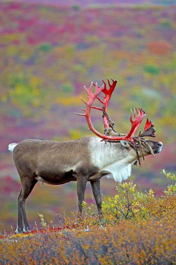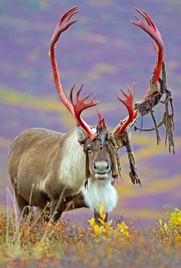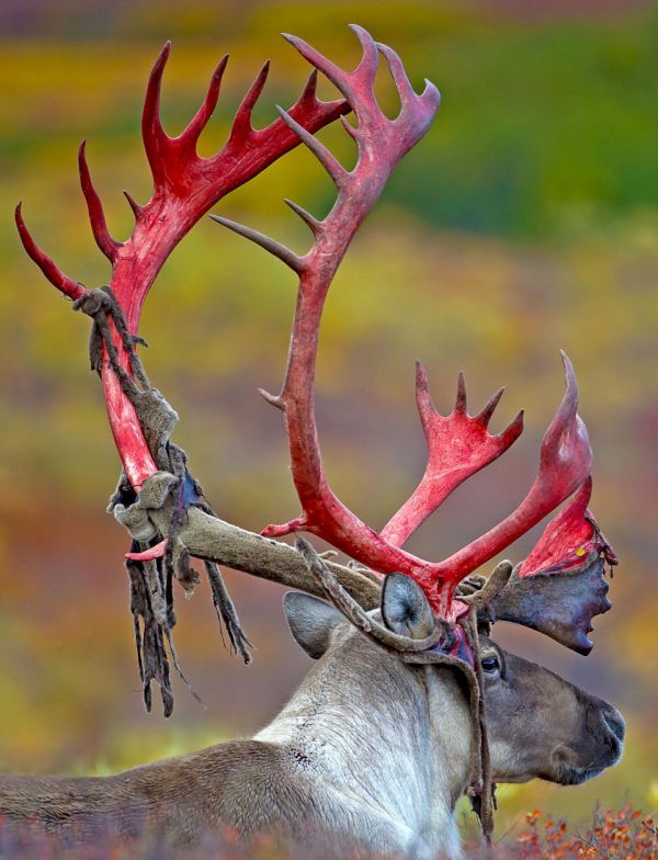 Молодые рога у оленей покрыты бархатистой кожицей, снабжающей их питательными веществами и кислородом. Когда рога отрастают и наступает время гона, бархат лохмотьями слезает. Процесс не вызывает дискомфорта у оленей, но выглядит это пугающе. Этот процесс в начале осени занимает всего пару дней. 70-летний биолог из Калифорнии Гэри Крамер смог сфотографировать оленя во время процесса избавления от бархата в национальном парке Денали, Аляска.