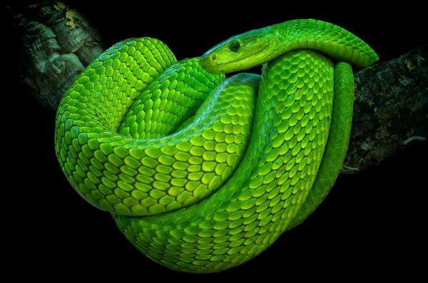 Ареал обитания – тропические леса Западной Африки. Средняя длина – 2 метра, но встречаются и более крупные особи. Они отличаются особой изящностью, продолговатая голова не сливается с туловищем, как у большинства змей. Окрас преимущественно зеленый. Чем старше рептилия, тем темнее цвет ее кожи. Змеи эти очень красивы, но приближаться к ним ни в коем случае нельзя. Зеленые мамбы обитают в лесах, но в последнее время зарегистрированы случаи их появления на чайных плантациях и даже в городских парках. После ее укуса человек проживет максимум полчаса, так как яд этой змеи приводит к параличу и некрозу. Но она очень пуглива, если ее не беспокоить, она не принесет вреда.
