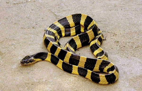 В длину достигает до 1,6 метра. У змеи очень интересный окрас, черные полоски на светло-желтом фоне. Ареал обитания – Юго-Восточная Азия, Таиланд, юг Бали, Суматра. Яд ее очень токсичен. Нередки случаи, когда человек умирает почти сразу же после укуса. Если сразу этого не произошло, то есть риск впасть в кому, умереть от паралича дыхательной системы. Кроме того, ее яд действует непосредственно на головной мозг. Малайский крайт не представляет опасности, если его не трогать. Рептилии активны ночью, большинство нападений совершается в темное время суток, когда змея выходит на охоту.