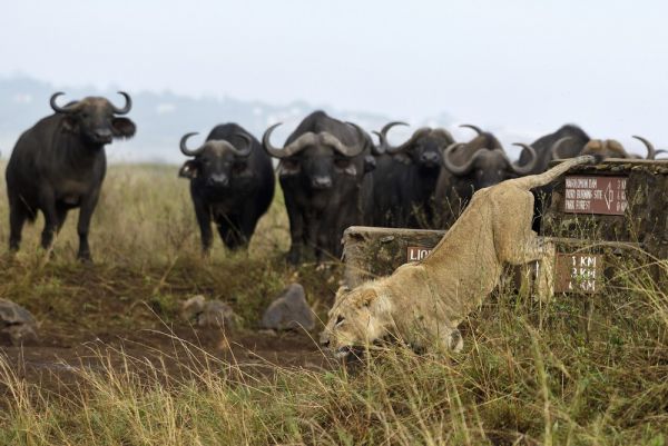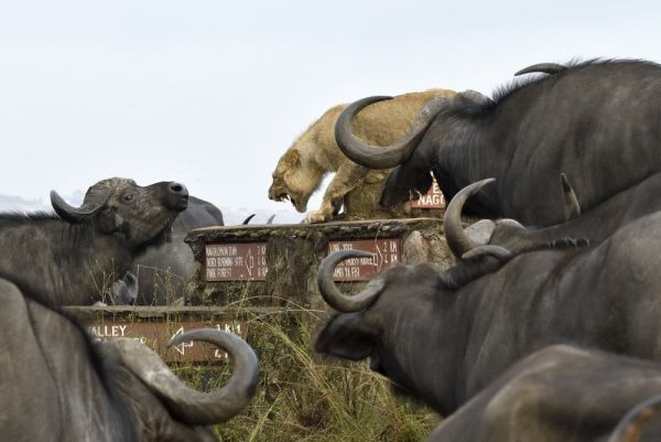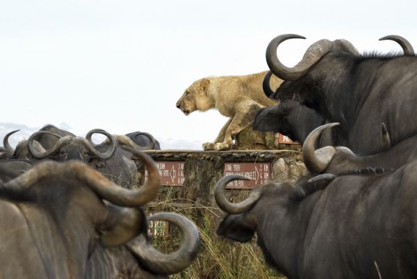 Редкие события запечатлел на камеру 56-летний Ламак Шейх во время путешествия 3 ноября по национальному парку Найроби, Кения. Стадо буйволов загнало молодого льва на вершину маркерного столба и окружило. Известно, что стадо такого размера может убить льва, если почувствует угрозу с его стороны. Но этому льву повезло: его рев услышали две тети-львицы и пришли на помощь. Они отвлекли буйволов и молодой лев смог сбежать.