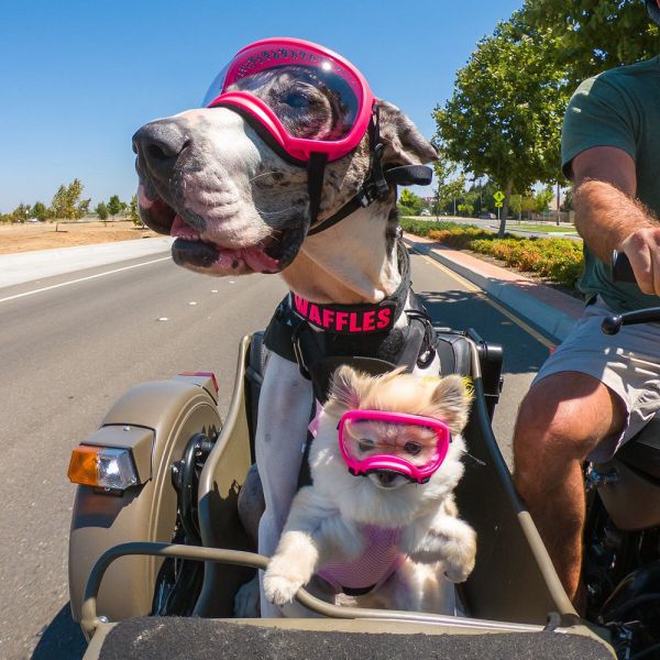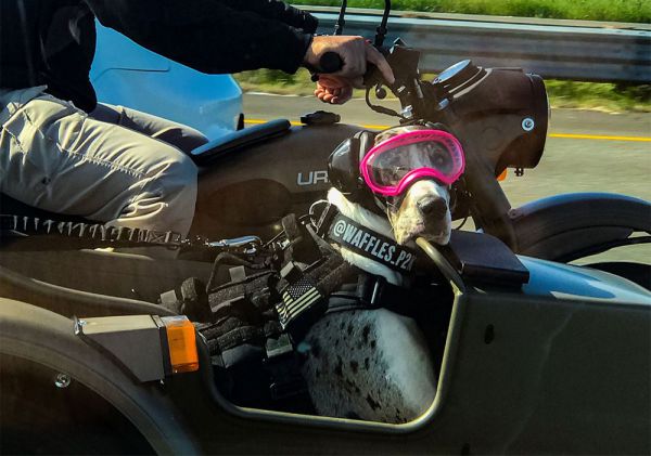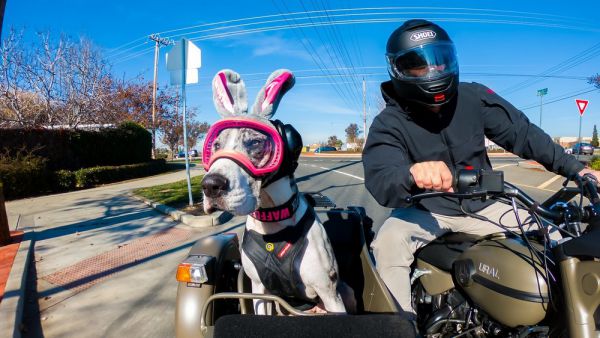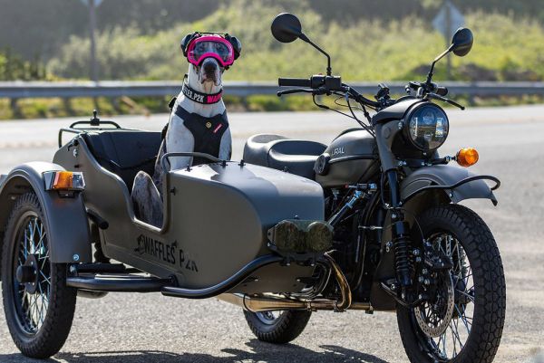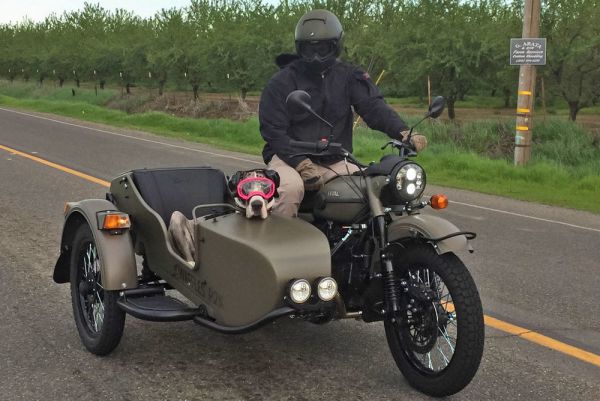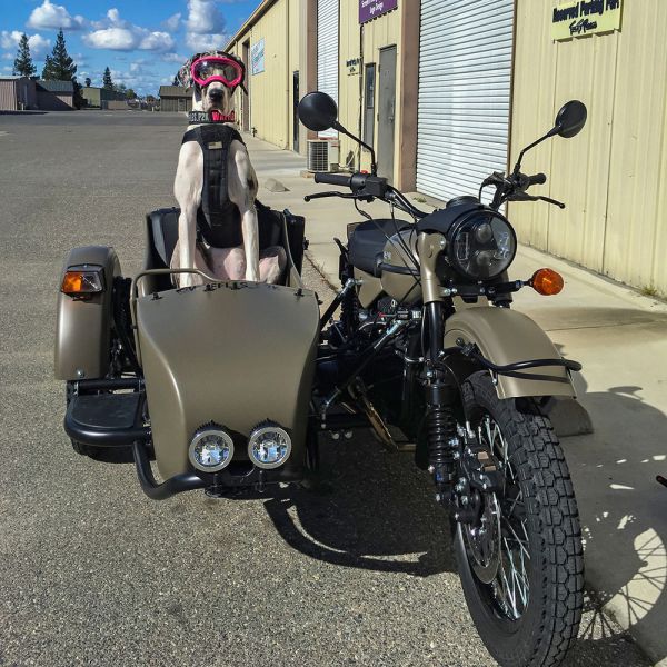 Дог любит кататься с хозяином в коляске "Урала" по Калифорнии