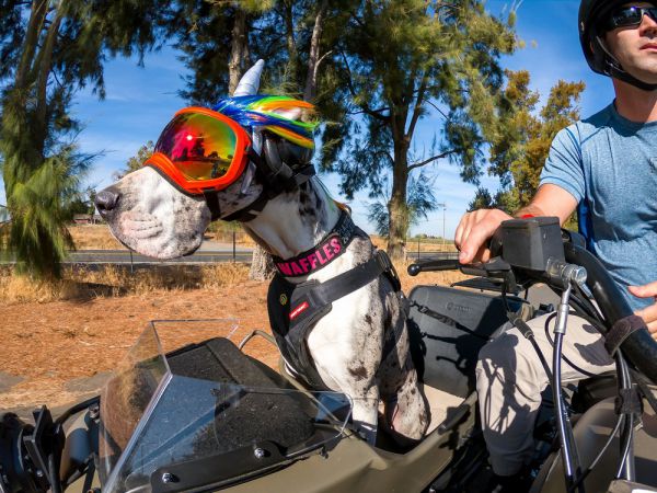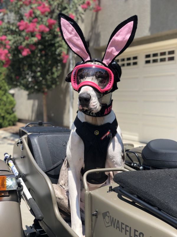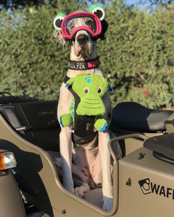 Знакомьтесь, это годовалый датский дог по кличке Waffles. Он живет с хозяином Райаном Бауманом (Ryan Bauman) в городе Модесто, Калифорния. Любимое занятие пса — кататься с Райаном по дорогам солнечного штата в коляске мотоцикла "Урал". Хозяин даже оборудовал коляску специальными ремнями безопасности для собаки.