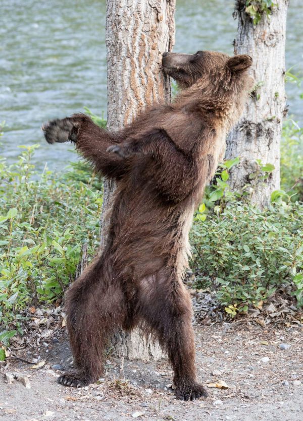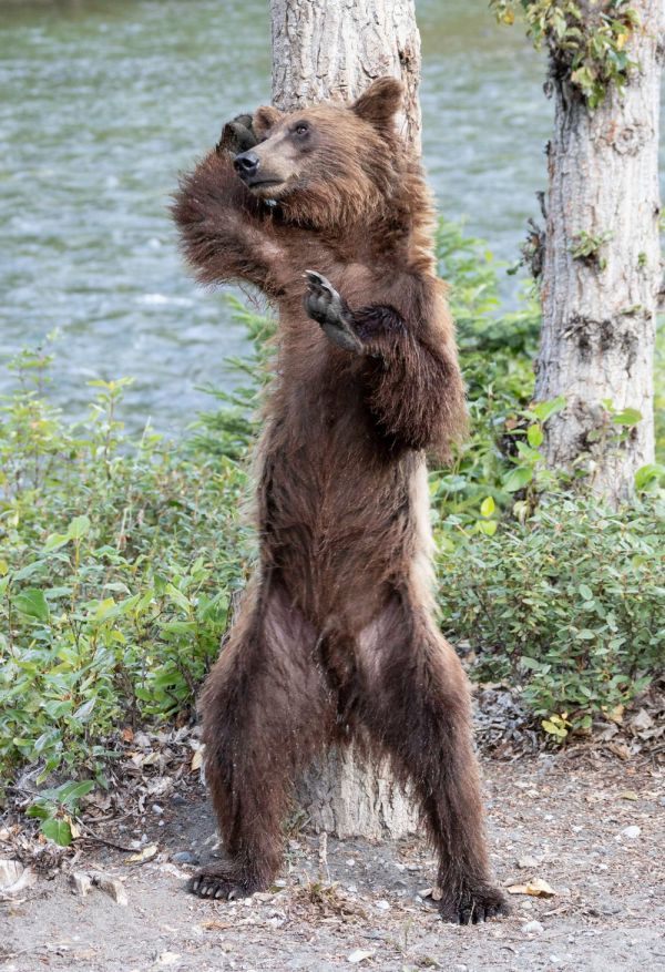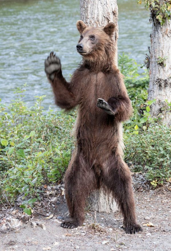 В Канаде медведь гризли устроил настоящее шоу прямо перед камерами фотографов, станцевав возле дерева.