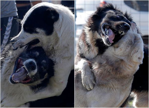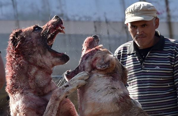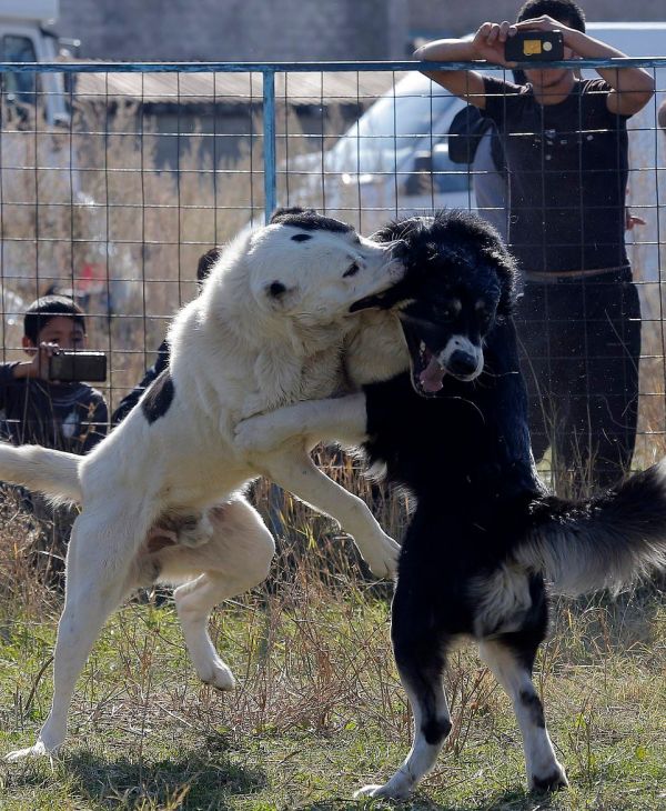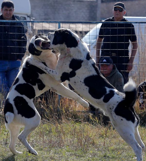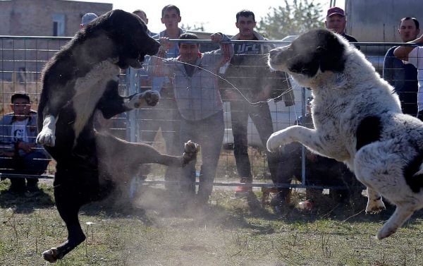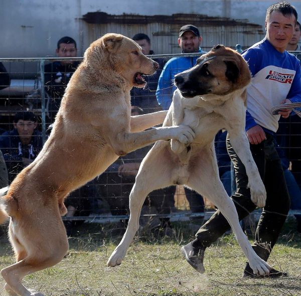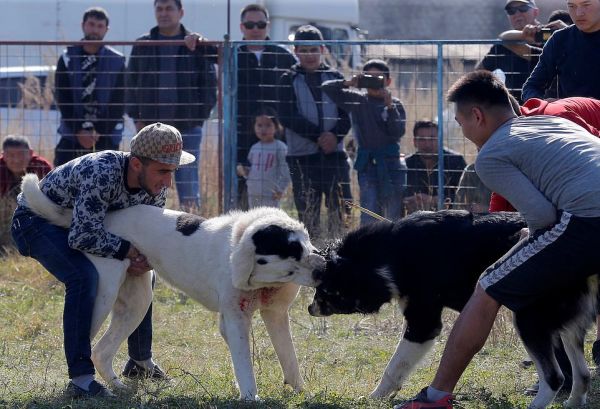 Бои между собаками породы овчарка прошли на арене в столице Бишкека в воскресенье. Среднеазиатские пастухи, или алабаи, отрывали друг от друга куски шерсти и визжали, истекая кровью. За боями наблюдала широкая аудитория, в том числе маленькие мальчики и девочки, некоторые снимали все происходящее на смартфоны.