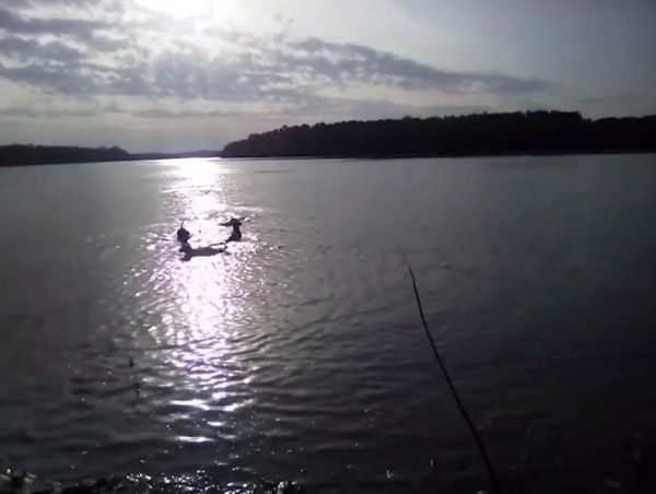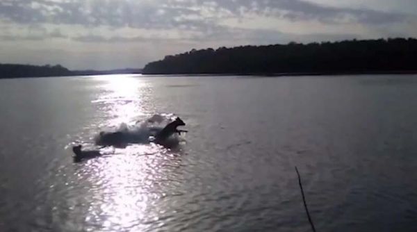 В этот момент две другие собаки прыгают и лают, тогда как владелец в страхе кричит, чтобы собака поскорее выбиралась из реки.