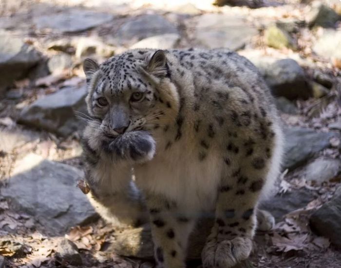 Частенько снежного барса встречают с хвостом в зубах. За другими кошачьими этого замечено не было. Зачем он это делает? Версия о том, что они заботятся о чистоте своего хвоста отбрасывается сразу. Точно не она.
