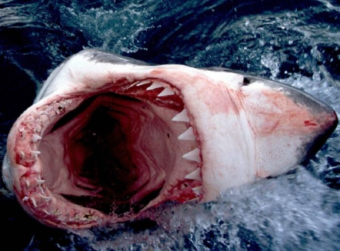 Кархародон – другое название акулы, отображающее ее особенности, которое происходит от греческих слов: «karcharos» и «odous» , что в переводе значит «острый зуб». Действительно большая белая акула – обладательница огромнейшей пасти, усеянной пятью рядами треугольных пятисантиметровых зубов, снабженных зазубринами на краях. С помощью верхних зубов акула разрывает свою добычу, а нижними зубами удерживает ее.