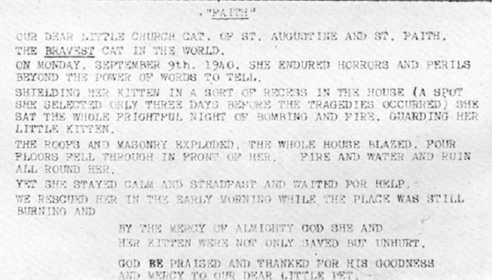 Очередной налёт немцы совершили 9 сентября. Под который попала и церковь Святого Августина. Людей внутри не было: пастор и прихожане уже знали, что им грозит, и после сигналов воздушной тревоги поспешили укрыться в бомбоубежище. После разбора завалов пожарные спросили у отца Генри, мог ли кто-то случайно остаться внутри. На что тот ответил, что только Фэйт и Панда – приходские кошки. Один из мужчин только сочувственно развёл руками: «Никто не смог бы там выжить. Боюсь, сэр, вы потеряли своих кошек...»