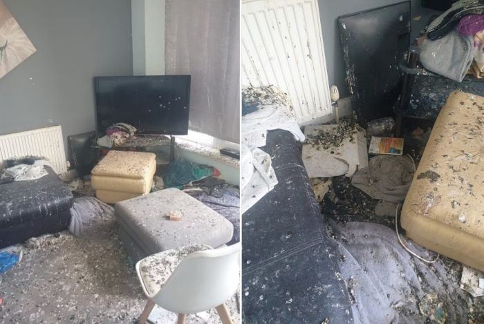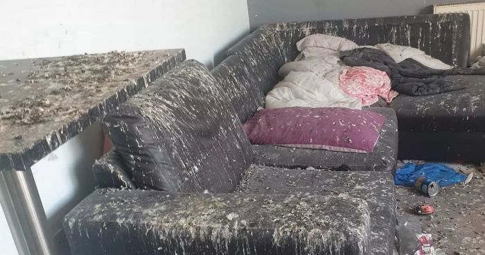 По словам руководителей службы борьбы с вредителями, гостиная представляла собой "печальное зрелище": диваны, ковер и телевизор стали жертвами надоедливых птиц.
