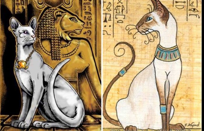 Интересно, что в Древнеегипетской мифологии действительно упоминается белый сфинкс с голубыми глазами, как хранителя святилища фараона. Тем не менее исследования показывают, что внешний облик древнеегипетских кошачьих статуэток имеет гораздо больше общего с современными Абиссинской породой и Египетской Мау. Характерные черты этих пород действительно напоминают изображения кошек в древнеегипетском искусстве. Это наблюдение позволяет предположить, что именно они являются прямыми потомками древнеегипетских кошек.