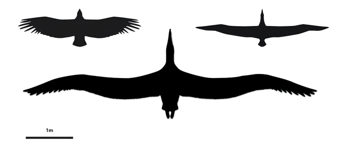 Пелагорнис Сандерса в сравнении с Андским кондором (Vultur gryphus) и странствующим альбатросом (Diomeda exulans)