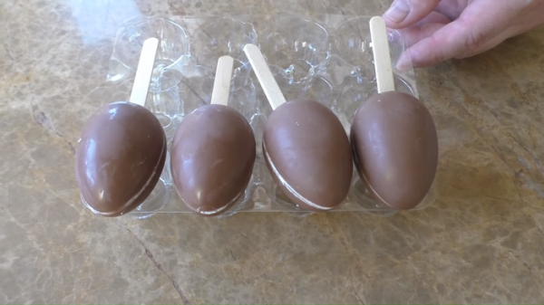 Каждую половинку шоколадного яйца заполняем взбитыми сливками. Между половинками вставляем деревянную палочку и отправляем в морозильную камеру на 2-3 часа (можно на ночь).