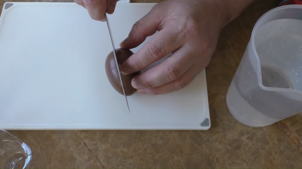 Шоколадные яйца разрезаем пополам. Аккуратно и лучше горячим ножом (опускаю в кипяток, после чего вытираем насухо).