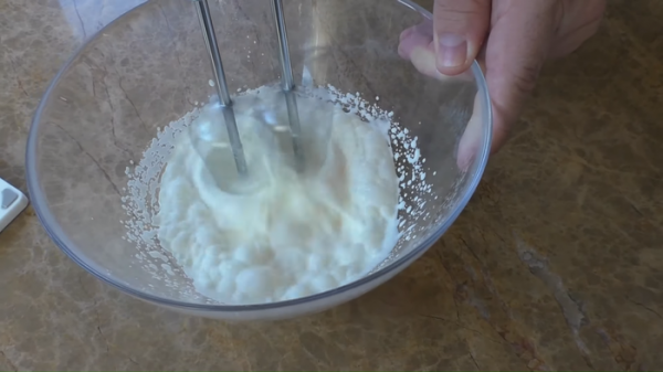 Сливки взбиваем миксером и постепенно добавляем сахарную пудру. Сладость регулируйте на свой вкус, нам хватает пары столовых ложек.